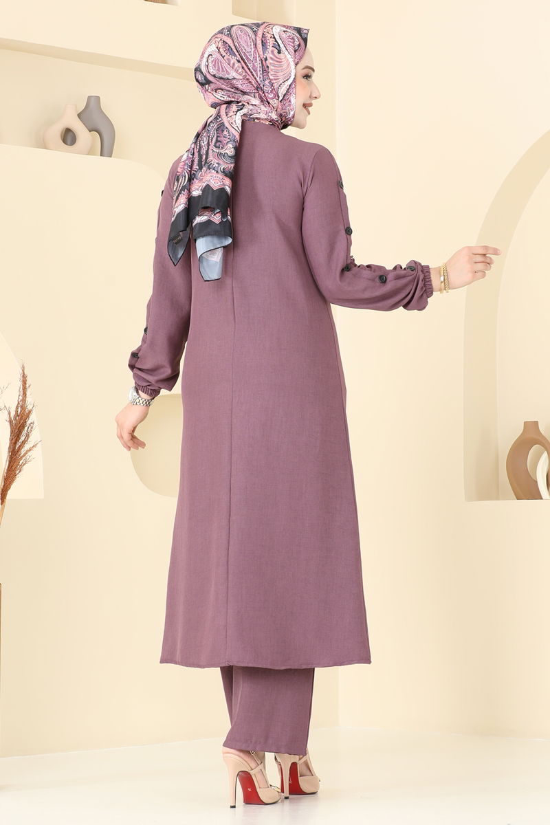 The Epaulet Detail Linen Suit is an ideal choice for sophisticated and modern modest fashion. Suitable for all seasons, this suit offers both comfort and style with its Sofia linen fabric. It is washable at 30 degrees on a gentle cycle, unlined, and features a back zipper for ease of use. The crew neck, button details, and elastic waistband on the trousers provide both comfort and an aesthetic look. The elastic cuffs on the tunic and trousers ensure freedom of movement. Key measurements of the model: height 165 cm, chest 88 cm, waist 68 cm, hips 99 cm, and weight 56 kg.