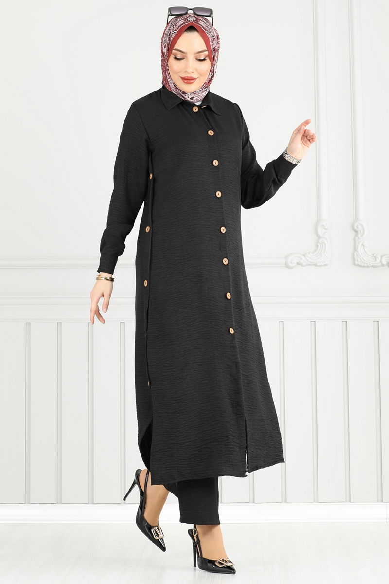 The Slit Buttoned Linen Suit is a modern and stylish modest wear combination. Made of Sofia Linen, it offers comfort throughout all seasons. Suitable for delicate washing, this set combines elegance with comfort. It includes a shirt-collared tunic and elastic-waisted pants. Front buttons and sleeve cuff buttons are functional. This versatile suit will become an essential part of your wardrobe for any occasion.