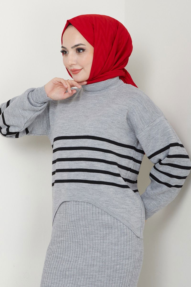 Striped Sweater Detail Dress model is a hijab product. It can be used in autumn and winter season. It should be washed at 30 degrees without squeezing. It is made of first class Knit fabric. The product has a Half neck. It is unlined. (The product on the model is a standard size.) The inner dress is worn from the head. The inner dress is sleeveless. The product is standard, suitable for 36-38-40 sizes.