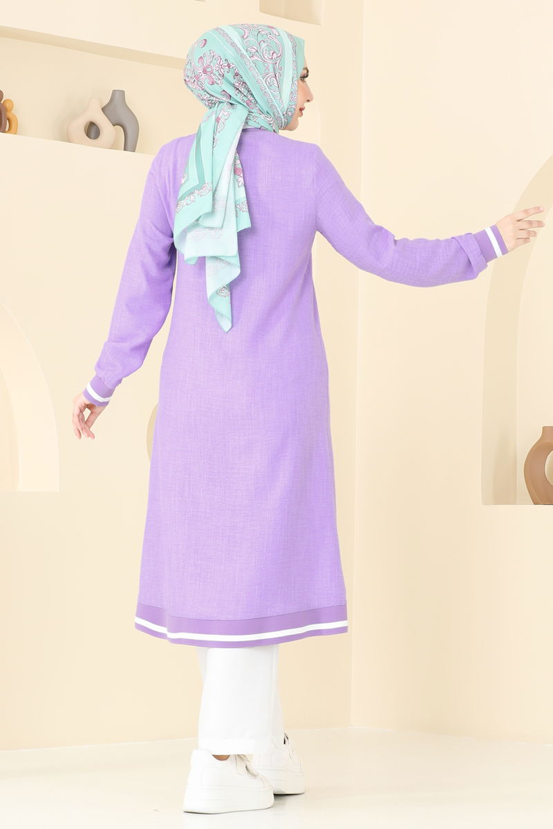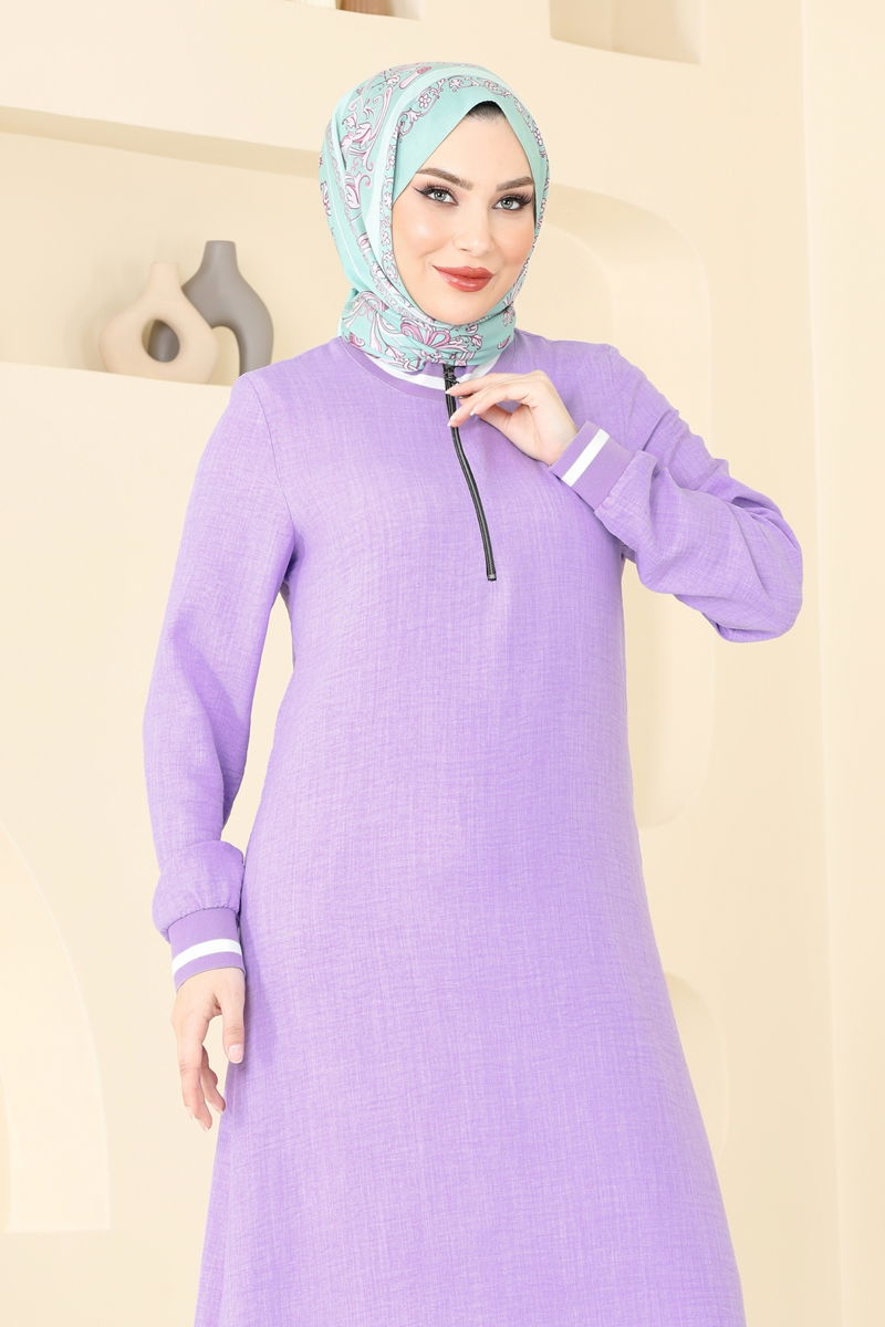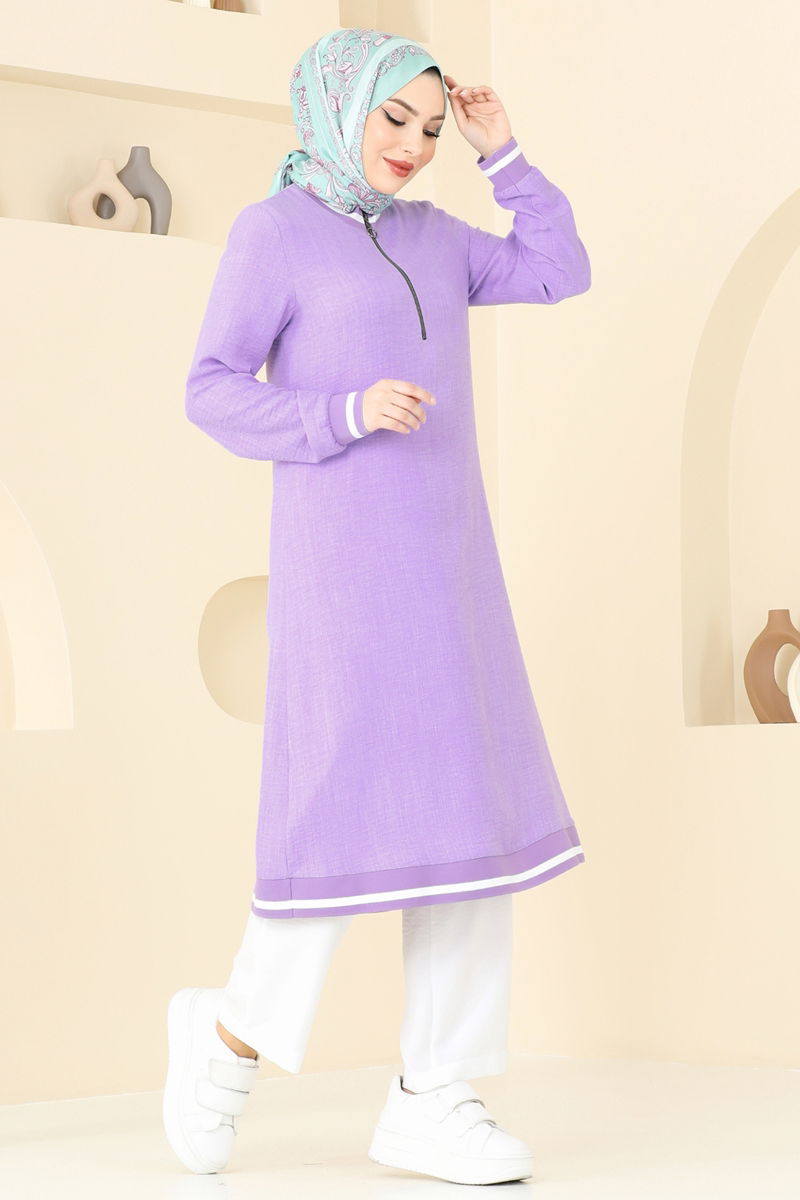 The Half-Zip Linen Suit is a distinguished hijab fashion piece designed for all-season wear. Made from delicate Sofia linen fabric, it offers a comfortable fit. This garment is machine washable at 30 degrees on a gentle cycle, ensuring its durability. Featuring a crew neck and unlined design, it provides a contemporary look while the elastic waist on the pants ensures a fit for all sizes. Comprising a tunic and pants, this set is perfect for those seeking both elegance and comfort in their attire.