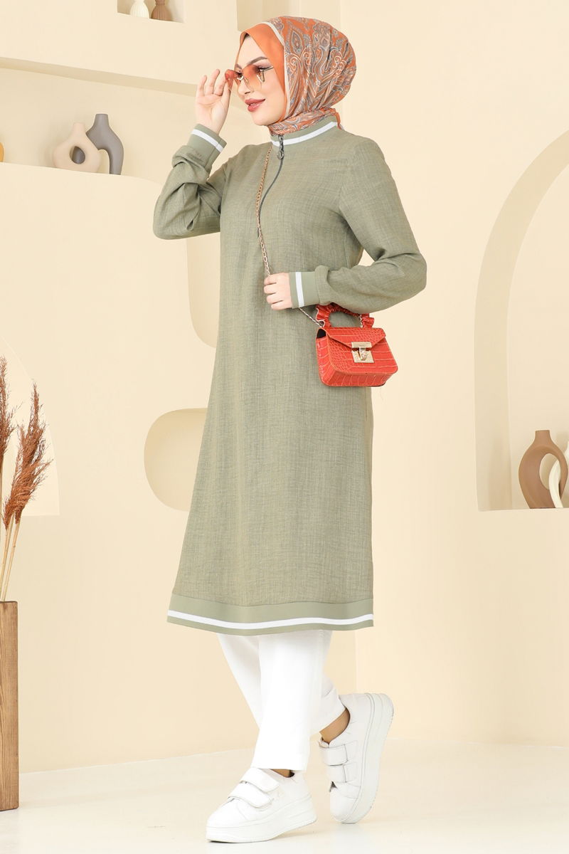 The Half-Zip Linen Suit is a distinguished hijab fashion piece designed for all-season wear. Made from delicate Sofia linen fabric, it offers a comfortable fit. This garment is machine washable at 30 degrees on a gentle cycle, ensuring its durability. Featuring a crew neck and unlined design, it provides a contemporary look while the elastic waist on the pants ensures a fit for all sizes. Comprising a tunic and pants, this set is perfect for those seeking both elegance and comfort in their attire.