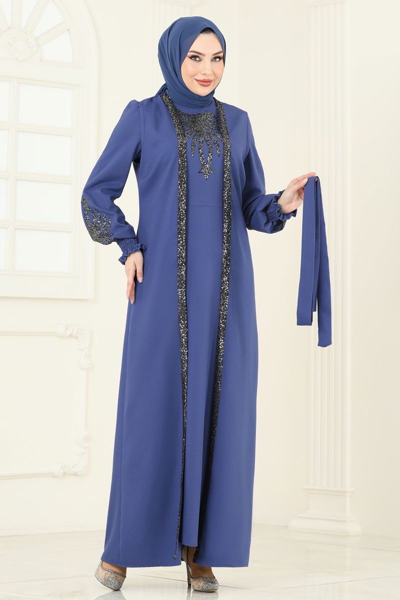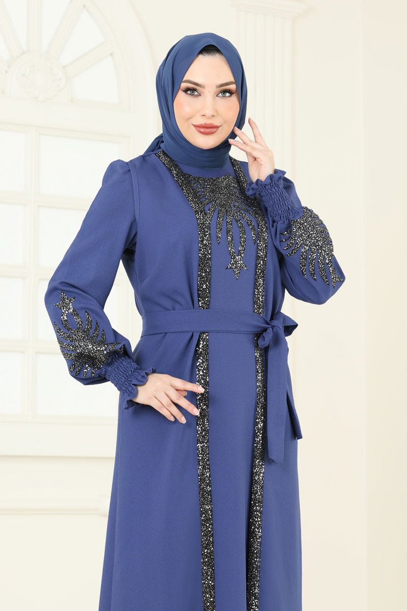 The Sequin Embellished Evening Suit model is specially designed for modest wear. This suit, which can be comfortably used throughout the four seasons, is made of crepe fabric and should only be dry cleaned. It offers comfort with its bike neck and unlined design, and has a zipper at the back. The sequin details and cardigan add an elegant appearance, while the belt completes the design's integrity. The belt can be optionally removed. The vest and evening skirt cuffs are elastic, bringing both elegance and comfort with this piece.