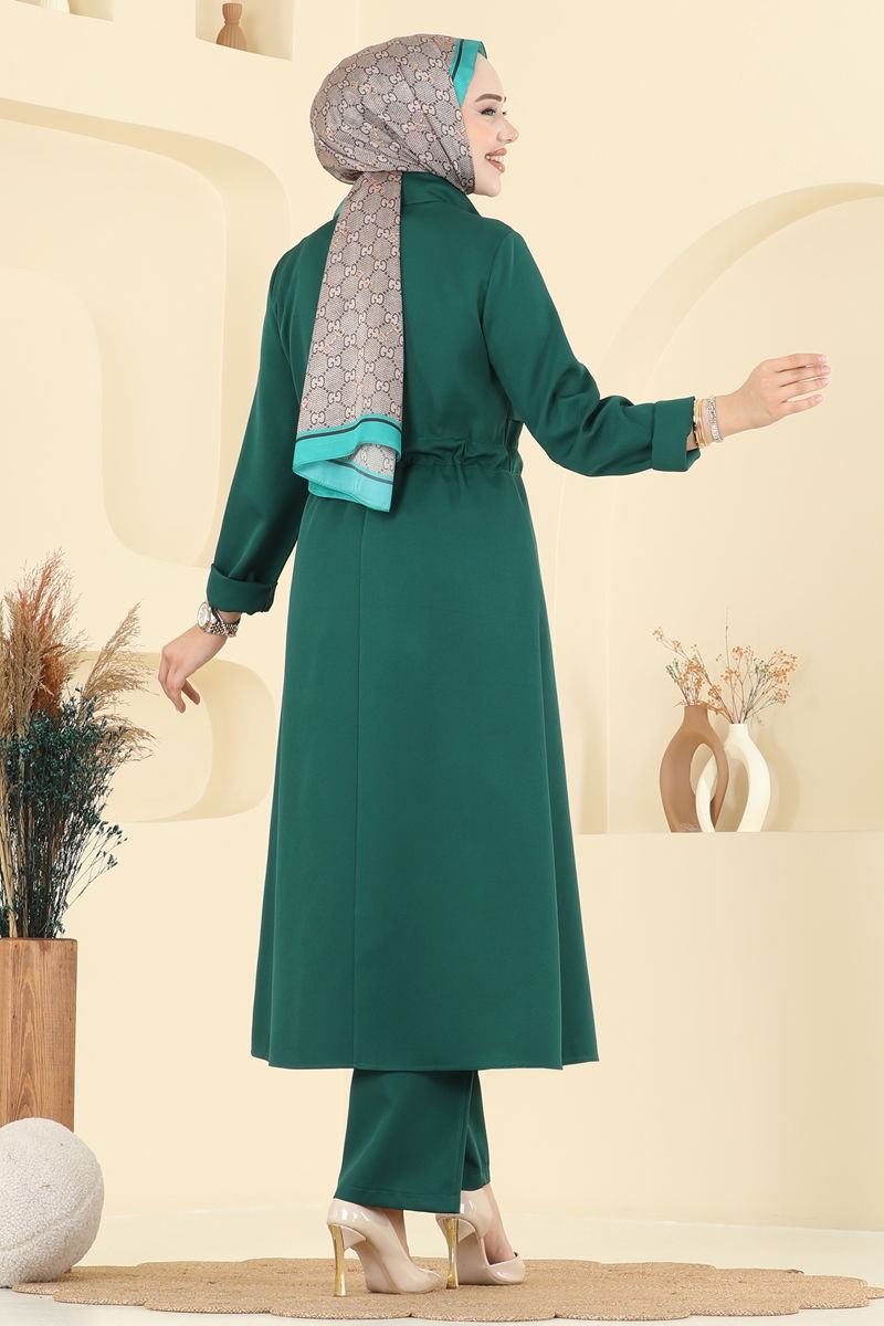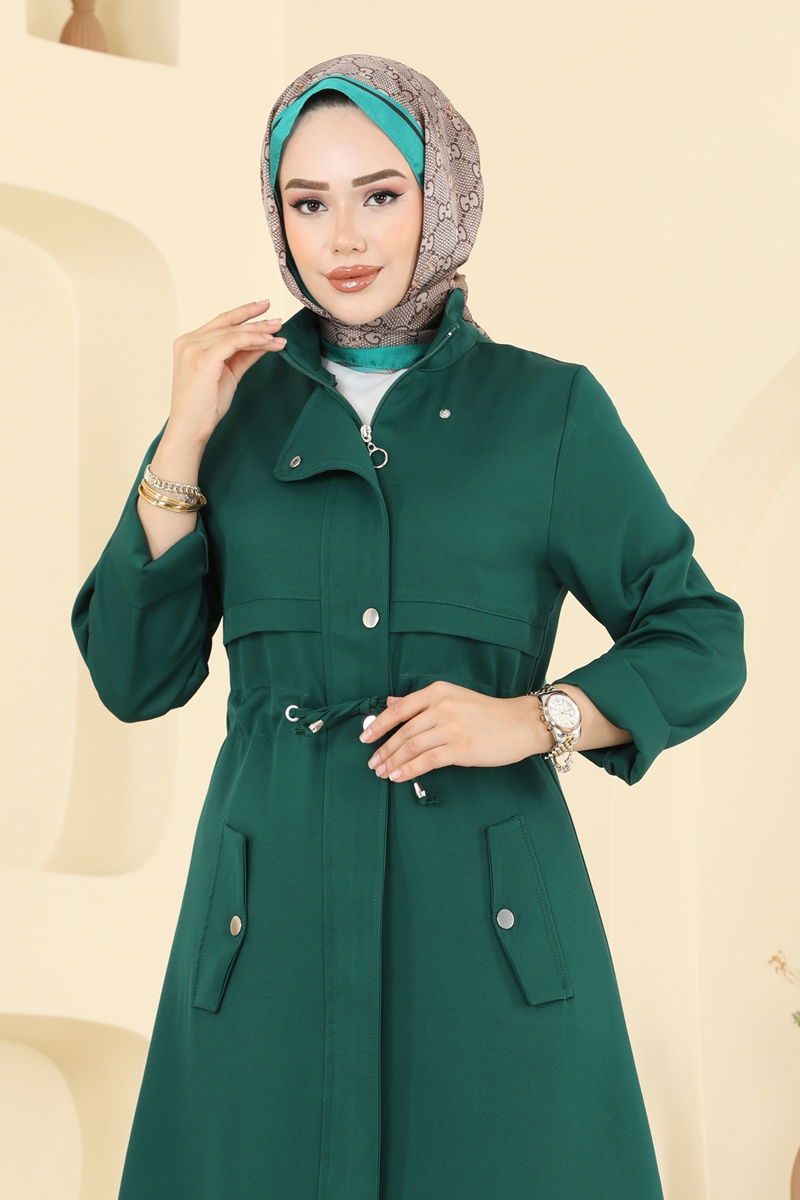 Product Feature : It is a new season hijab fashion product. It has a laced waist. The product has a Judge collar. Unlined. The product has a zipper at the From the front part. Snap details are active. Pocket detail is an accessory. The waist of the trousers is elastic. There may be a tonal difference in the product due to concept photo shoots.