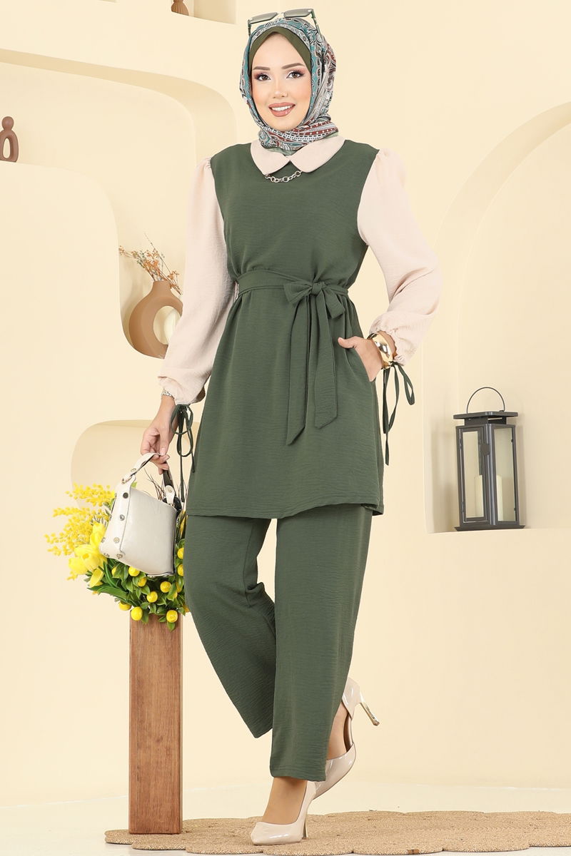 Product Feature : It is a new season hijab fashion product. The product has a Shirt collar. Unlined. The product has a zipper at the from the back part. The product has a shirt collar. It is sewn on the tunic. Belt included, optional not available. The waist of the trousers is elastic. The cuff is laced. There may be a tonal difference in the product due to concept photo shoots.