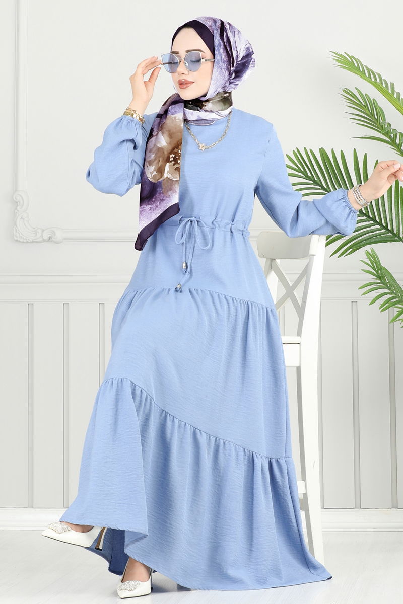 The Layered Skirt Sofia Dress is specially designed for modest dress. Suitable for all seasons, this model can be washed at 30 degrees on a delicate setting. Made from Sofia linen fabric, it is durable and elegant. It has a crew neck and is unlined for a modern touch. Featuring a button at the back and a drawstring waist, the dress increases comfort with its elasticated cuffs. The product displayed on the model is size 38, ensuring you remain stylish in every setting.