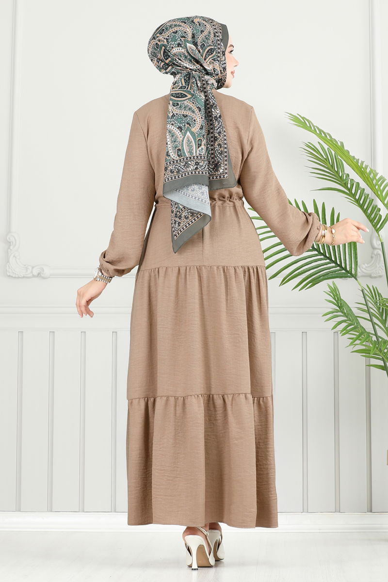 The Layered Skirt Sofia Dress is specially designed for modest dress. Suitable for all seasons, this model can be washed at 30 degrees on a delicate setting. Made from Sofia linen fabric, it is durable and elegant. It has a crew neck and is unlined for a modern touch. Featuring a button at the back and a drawstring waist, the dress increases comfort with its elasticated cuffs. The product displayed on the model is size 38, ensuring you remain stylish in every setting.
