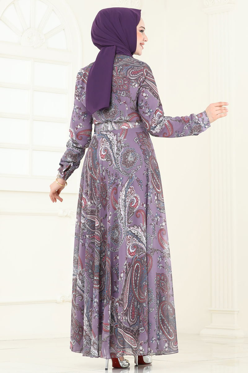 The Coated Belted Chiffon Dress is a stylish modest wear that can be comfortably worn across all seasons. It can be washed in a gentle cycle at 30 degrees Celsius. Made from chiffon fabric, this dress features a mandarin collar and is lined for added comfort. The side zipper makes it easy to wear, and it comes in a standard size 38. The belt is a significant detail that completes the elegance of the dress and can be optionally removed. It is tailored to prevent any waving at the ends while the center remains stitch-free. The cuffs are functional and add a stylish touch. The dress measurements include a length of 165 cm, a chest of 88 cm, a waist of 68 cm, hips of 99 cm, and a weight of 56 kg. This dress is suitable for special occasions or everyday wear, offering an elegant appearance.