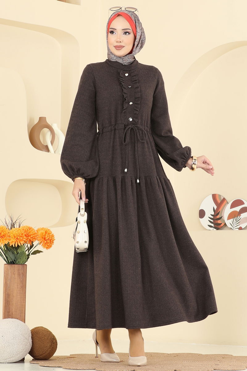 The Ruffle Detail Belted Tunic Dress is specially designed for modest fashion. Suitable for Autumn and Winter, this dress can be washed delicately at 30 degrees Celsius. Made from herringbone fabric, it features a semi-mandarin collar and is unlined. The dress has a back zipper and a belted waist for comfortable wear. Its elasticated cuffs and decorative buttons add a stylish touch. The product shown on the model is size 38.