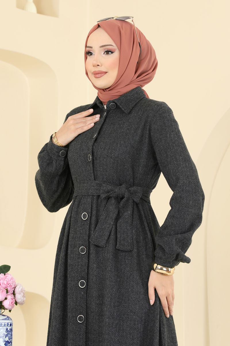 The Herringbone Dress with Shirt Collar is an elegant option suitable for modest fashion. Ideal for Autumn and Winter, this dress can be washed at 30 degrees with a gentle cycle. Made from unique herringbone fabric, this model offers a classic and chic look with its shirt collar design and buttons at the front. Its lining-free design provides a light and comfortable fit. The dress is sized at 38 and ensures a comfortable fit with an elastic waistband. The specially sewn belt, designed to prevent waviness, can be optionally removed or used. Active cuff buttons enhance the attention to detail.