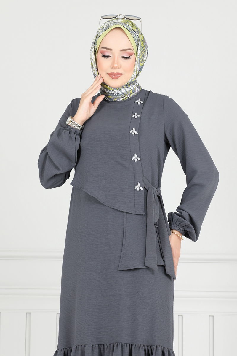 Dazzle in this stone detailed dress, a chic addition to modest fashion. Made from Aerobin fabric, this dress can comfortably be used across all four seasons. Recommended for gentle washing at 30 degrees, it is easy to care for. Featuring a crew neck and unlined design, it offers a contemporary look while the button at the back and the side-tie belt enhance its elegance. Elastic cuffs add to the comfort, while the stone details bring a touch of sophistication. The sewn-in belt adds functionality. Available in size 38, this model also comes in various sizes.