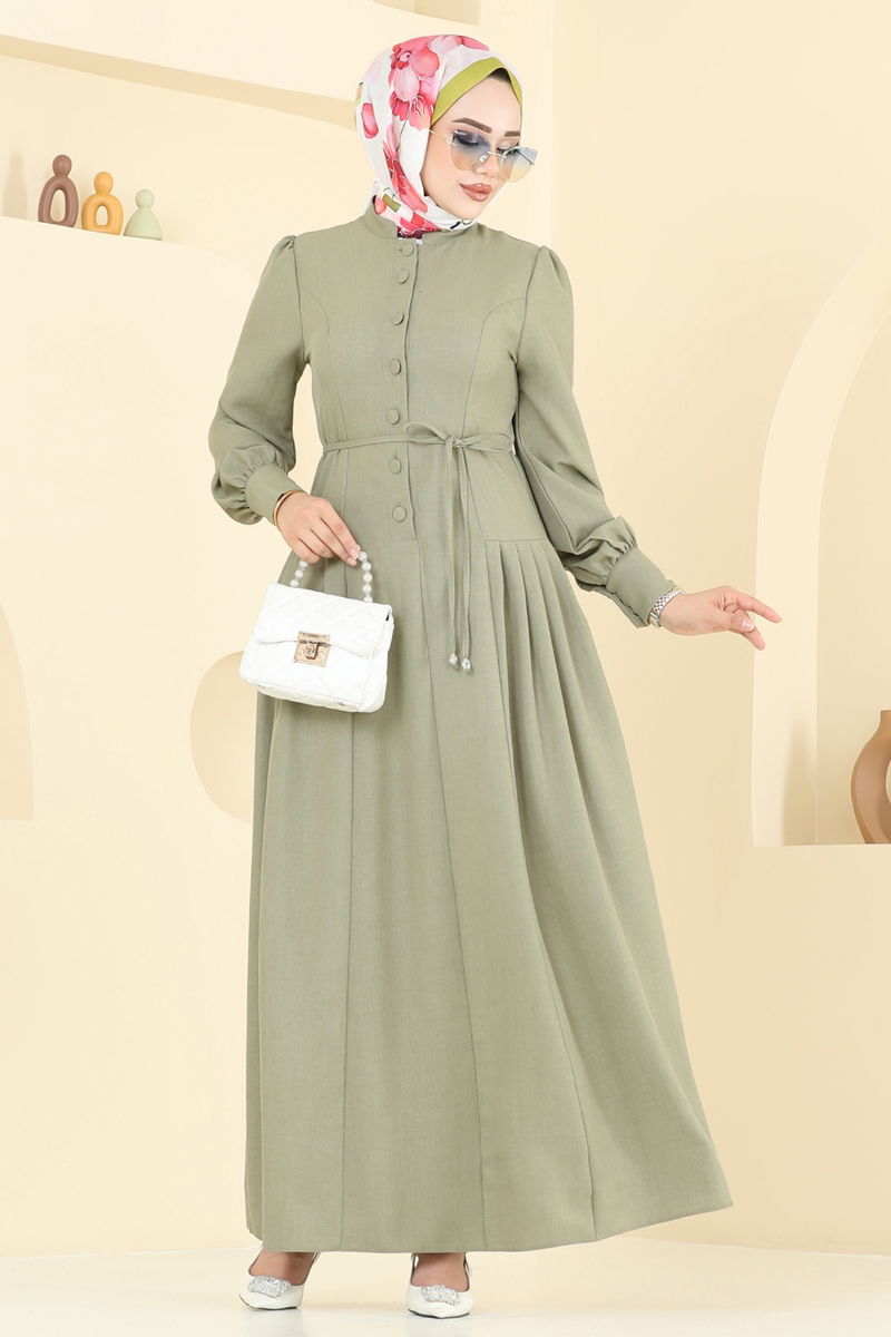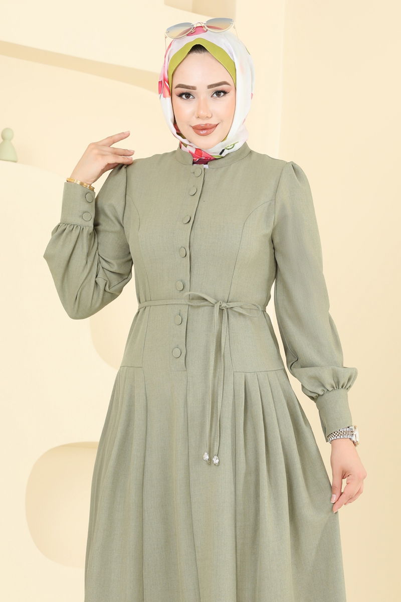 The Half-Buttoned Sofia Dress is a specially designed modest wear suitable for all seasons. Made from linen fabric, this dress should be washed at 30 degrees on a gentle cycle. It features a semi-mandarin collar and a front half-button design that offers a modern and stylish look. The unlined structure makes it lightweight and comfortable. The included belt is carefully stitched to prevent waving and its use is optional. Active cuff buttons add functionality.