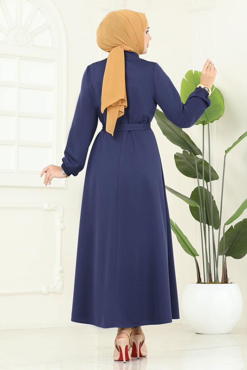 The Floral Embroidered Dabıl Dress is a specially designed modest wear suitable for all seasons. It can be washed gently at 30 degrees and is made of knitted Dabıl fabric. Featuring a shirt collar design, this dress offers practicality with its half-button front closure. Unlined, with embroidered details and elastic cuffs, it combines elegance with comfort. The belt of the dress is stitched at both ends to prevent sagging, with an unstitched middle section, and can be optionally removed.