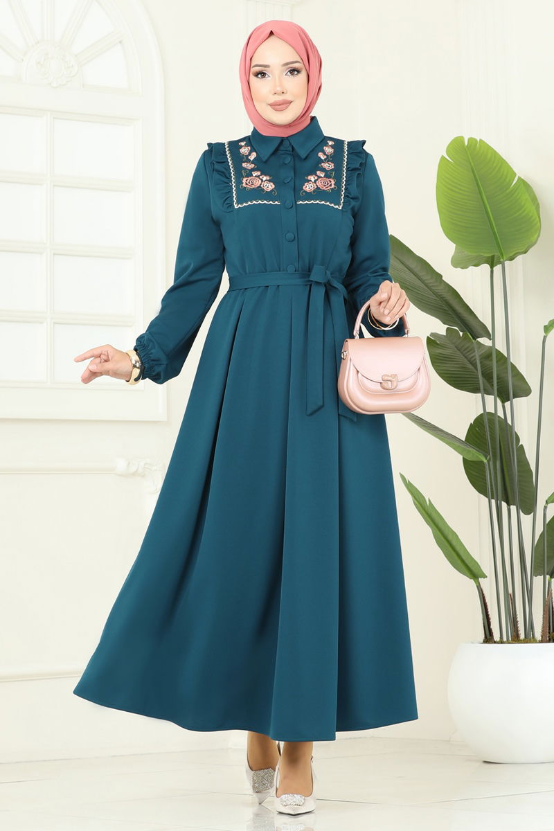 The Floral Embroidered Dabıl Dress is a specially designed modest wear suitable for all seasons. It can be washed gently at 30 degrees and is made of knitted Dabıl fabric. Featuring a shirt collar design, this dress offers practicality with its half-button front closure. Unlined, with embroidered details and elastic cuffs, it combines elegance with comfort. The belt of the dress is stitched at both ends to prevent sagging, with an unstitched middle section, and can be optionally removed.