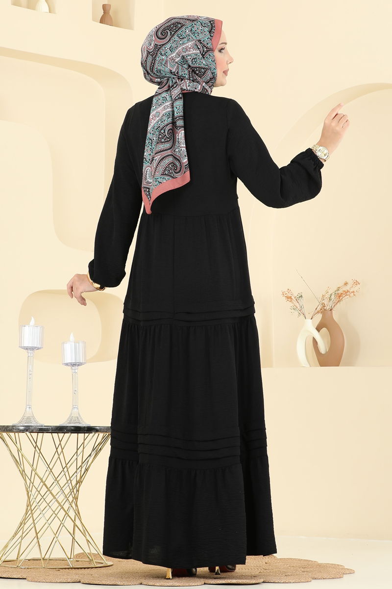 Featuring a tiered and elegant design, the Aerobin Dress is comfortable to wear in all seasons. Made from Aerobin fabric, it is lightweight and breathable, ensuring comfort throughout the day. The dress is designed for modesty with a bicycle neckline and elastic cuff details, presenting a modern look. It's unlined for a light and comfortable wear, and can be washed at 30 degrees on a gentle cycle. It also features a button at the back for easy wear.