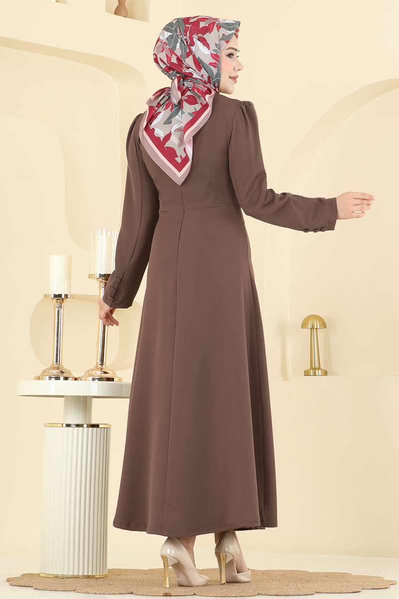 Combining elegance and comfort, the V-Neck Accessory Button Dress is a year-round suitable modest wear. It can be washed with care at 30 degrees and is made from durable yet lightweight Dabil fabric. Designed with a V-neckline and a zipper at the back, it offers practical wearability. The added buttons and cuff details complete your look with a touch of sophistication. Remember, the product model displayed is a size 38.