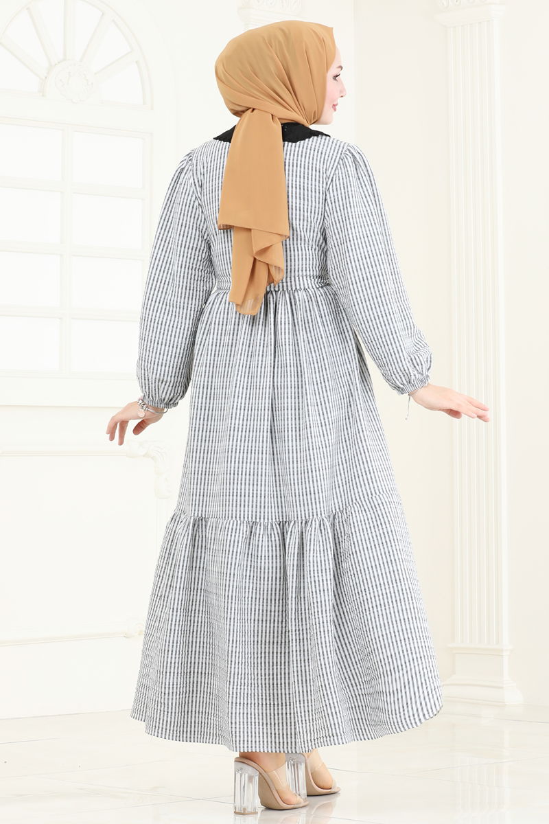 The Half-Buttoned Hijab Dress is an all-season model offering convenience. Made from crepe fabric, it can be washed gently at 30 degrees combining durability and comfort. Its collarless and lining-free design provides a light and elegant look. The front half-buttons and elastic cuffs add both practicality and aesthetic detail to the dress. Moreover, the specially sewn belt that prevents sagging adds a modern touch to the dress. The belt is removable, according to preference.