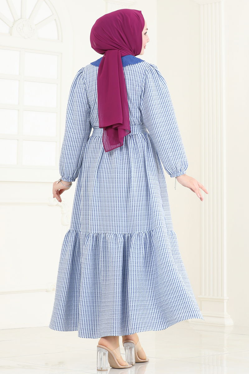 The Half-Buttoned Hijab Dress is an all-season model offering convenience. Made from crepe fabric, it can be washed gently at 30 degrees combining durability and comfort. Its collarless and lining-free design provides a light and elegant look. The front half-buttons and elastic cuffs add both practicality and aesthetic detail to the dress. Moreover, the specially sewn belt that prevents sagging adds a modern touch to the dress. The belt is removable, according to preference.