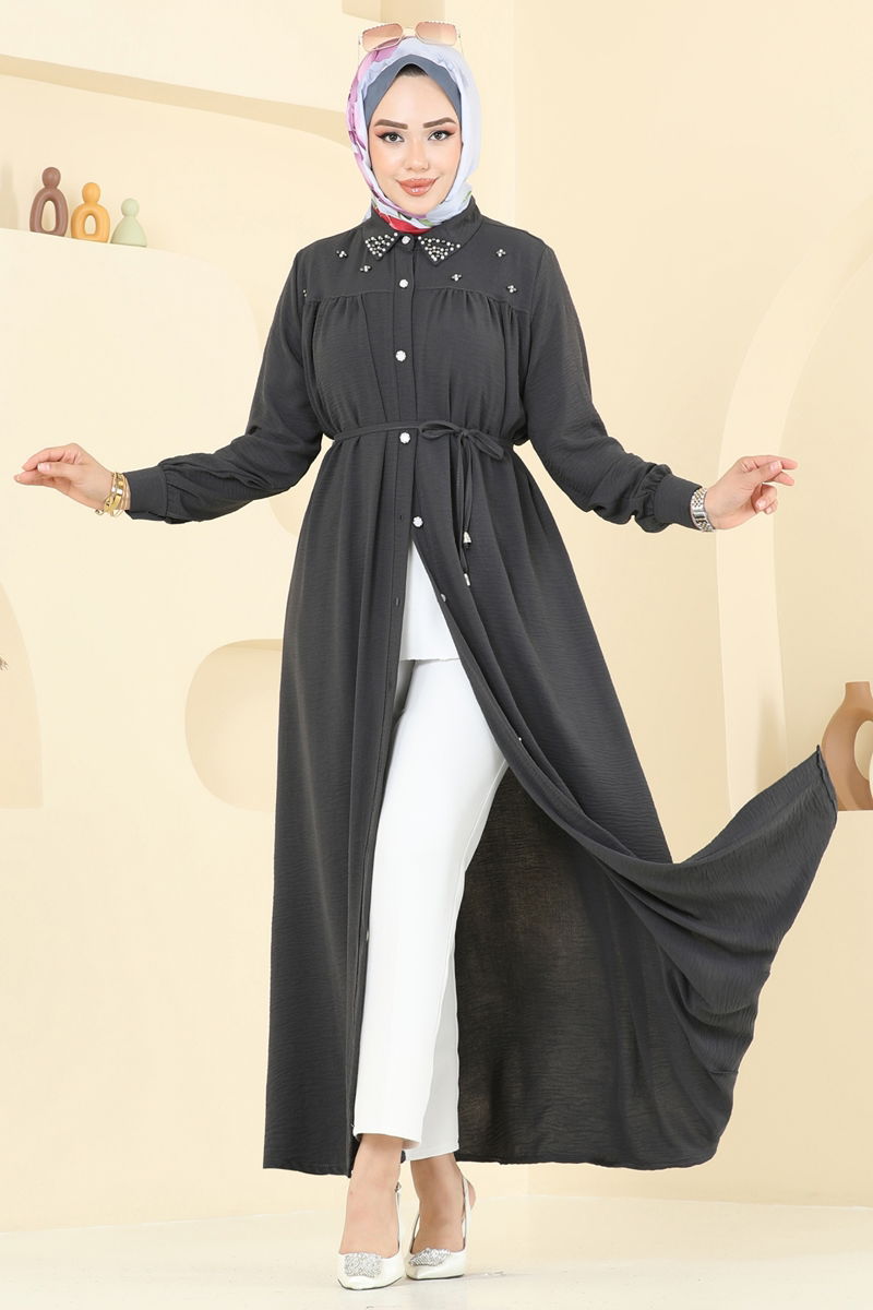 Dazzle with unique bead details in the Beaded Dress Ferace, designed for your comfort and elegance every season. Made from aerobin fabric suitable for gentle wash at 30 degrees, this ferace offers practical use with its shirt collar and front button details. The unlined structure provides a light and comfortable experience, while the active buttons on the cuffs enhance functionality. The belt detail can be optionally used to create a different style, making it an indispensable piece for any wardrobe.