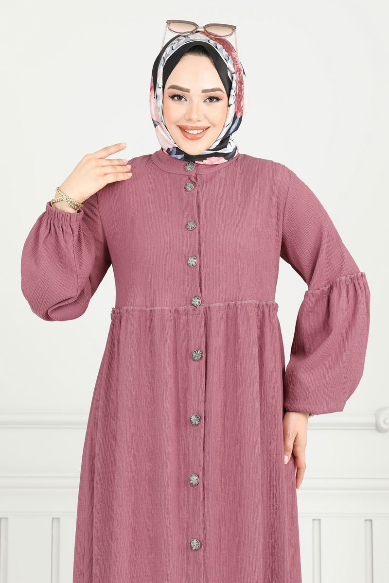 Experience both comfort and elegance in all seasons with the 'Front Buttoned Hijab Dress'! This dress, which can be washed at 30 degrees with its delicate structure, offers long-lasting use thanks to its bürümcük fabric. The semi-standing collar and front-button design provide a modern look, while the elastic cuffs complete the design. The unlined structure provides light and comfortable wear, and its belted seam design perfectly fits your body contours.