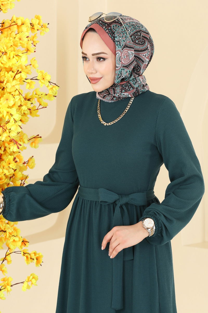 The Tiered Belted Dress is a distinctive hijab fashion item, made from twist fabric which makes it suitable for all seasons. It can be gently washed at 30 degrees and features a crew neck design. The dress, which is cuff-elastic and unlined, has a seamed waist. The belt is designed with both ends sewn, leaving the middle part unsewn, included with the dress and can be optionally omitted.