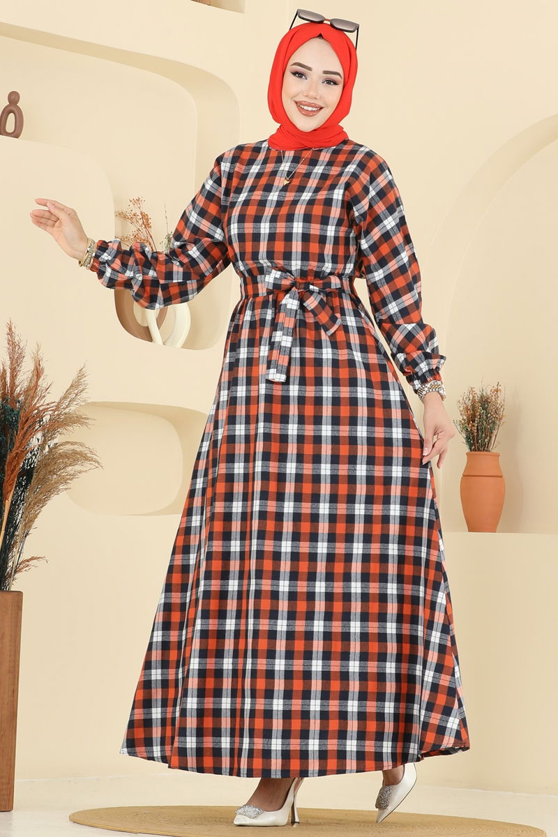 The Drawstring Plaid Dress is designed to fit modest fashion needs. Ideal for Autumn and Winter, this dress can be washed gently at 30 degrees. Made from plaid fabric, it is unlined with a crew neckline. It features an elastic waist for comfort, and the drawstring provides an elegant look which is optional. The cuffs are also designed with elasticity. The product shown is in size 38.