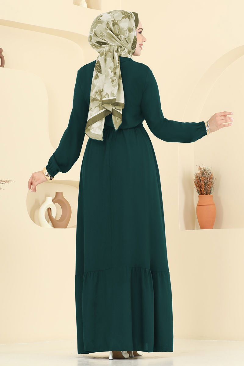 The Front Half-Buttoned Dress is ideal for those who prefer modest clothing. Suitable for all seasons, this dress is made from high-quality viscose fabric. It offers a practical yet stylish look with front half-button details. Featuring a semi Mandarin collar and elastic cuffs, it presents a modern posture. The included belt, which can be optionally used, enhances your silhouette. It is recommended to wash delicately at 30 degrees Celsius.