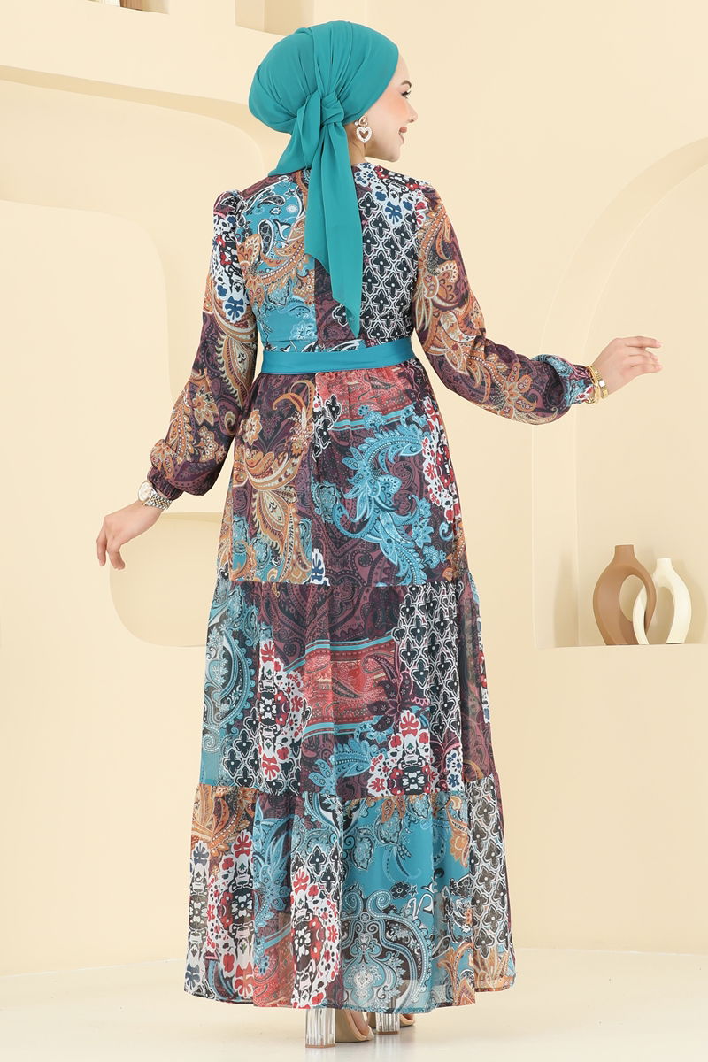 The Ethnic Pattern Chiffon Dress is a modest attire suitable for all seasons. Made from 100% chiffon, this dress can be washed at 30 degrees on a delicate cycle. It features a crew neck design and is fully lined for added elegance. The back is zippered, and the buttons are purely decorative. The belt detail is designed to prevent any waving, stitched at ends, with a middle part left seamless; it can be removed optionally. This dress also has elasticated cuffs, making it both comfortable and stylish.Dress SIZE DIMENSIONS (CM)Size Chest Length 38 96 140 40 100 140 42 104 140 44 108 140 46 112 140 48 116 140 Weight (Kg):0.49 -