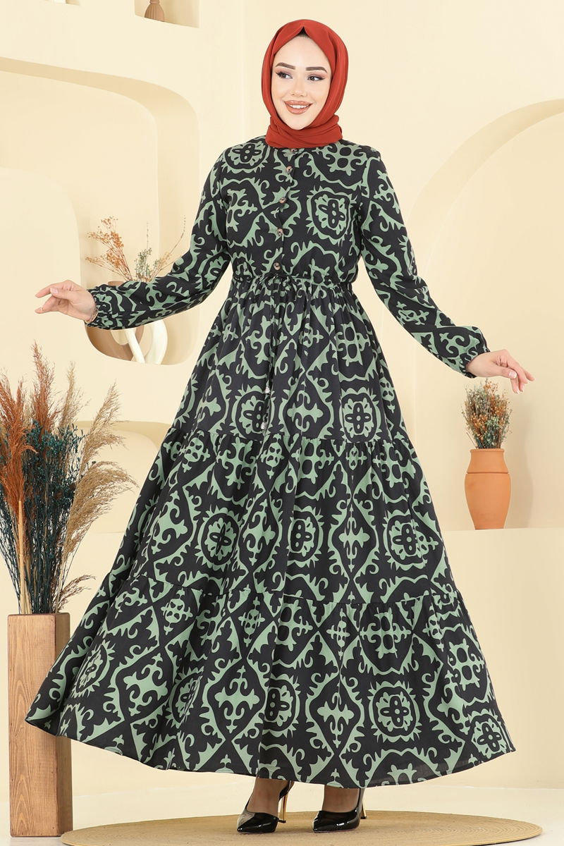 Introducing our stylish Patterned Dress, suitable for all seasons. Made from carefully chosen viscose fabric, this dress offers both style and comfort. The half high collar and front half button details allow for practical wear, while the lining-free design keeps it light and airy. Elastic cuffs add a modern twist to the dress, which is best maintained through hand washing. Its drawstring waist adjusts to fit your body shape, enhancing your elegance.