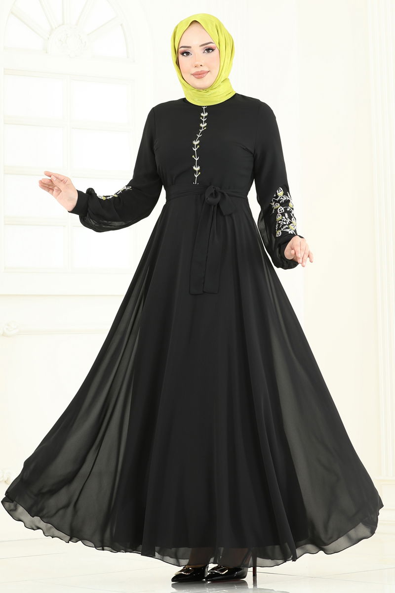 The Embroidered Chiffon Dress combines elegance and comfort, making it an ideal choice for modest attire throughout the seasons. Noteworthy for its delicate and sophisticated details, this dress can be cleaned with a gentle wash at 30 degrees Celsius. Its soft chiffon fabric and mandarin collar design offer an elegant appearance, while its lined structure increases comfort. This model, which features a zipper at the back, dazzles with its embroidery details. The included belt adds to its elegance, helping it maintain shape, while the functional cuff buttons stand out as a practical feature.
