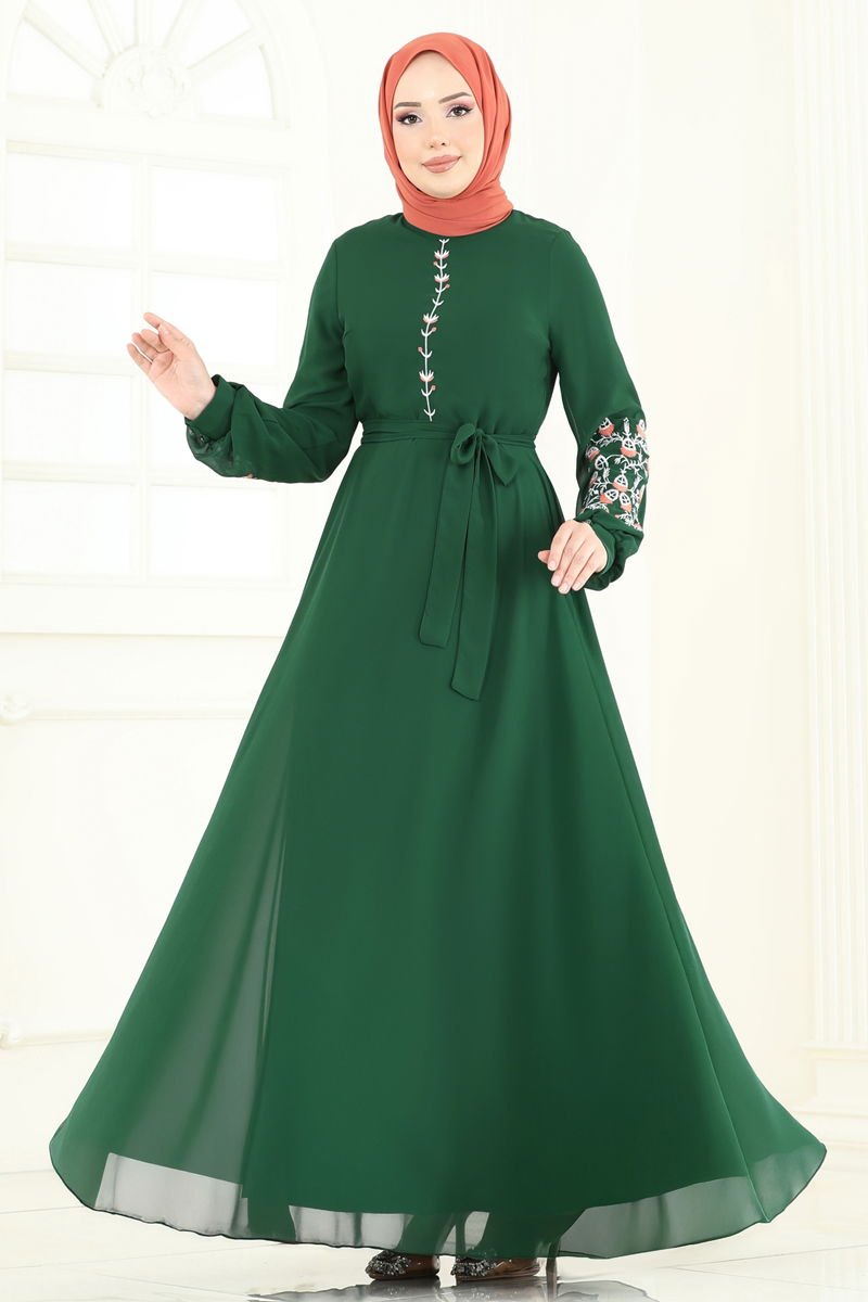 The Embroidered Chiffon Dress combines elegance and comfort, making it an ideal choice for modest attire throughout the seasons. Noteworthy for its delicate and sophisticated details, this dress can be cleaned with a gentle wash at 30 degrees Celsius. Its soft chiffon fabric and mandarin collar design offer an elegant appearance, while its lined structure increases comfort. This model, which features a zipper at the back, dazzles with its embroidery details. The included belt adds to its elegance, helping it maintain shape, while the functional cuff buttons stand out as a practical feature.