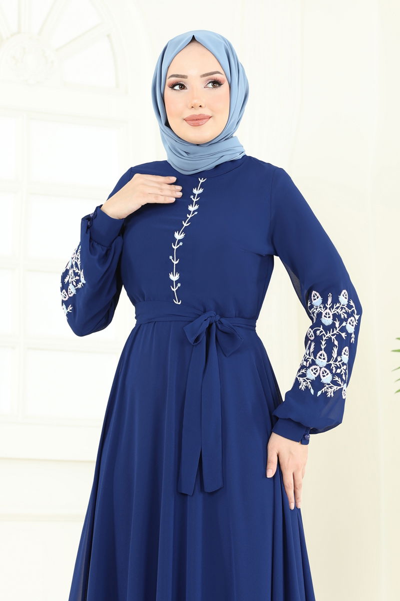 The Embroidered Chiffon Dress combines elegance and comfort, making it an ideal choice for modest attire throughout the seasons. Noteworthy for its delicate and sophisticated details, this dress can be cleaned with a gentle wash at 30 degrees Celsius. Its soft chiffon fabric and mandarin collar design offer an elegant appearance, while its lined structure increases comfort. This model, which features a zipper at the back, dazzles with its embroidery details. The included belt adds to its elegance, helping it maintain shape, while the functional cuff buttons stand out as a practical feature.