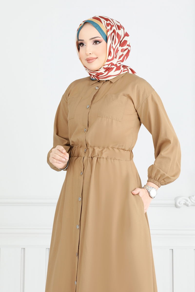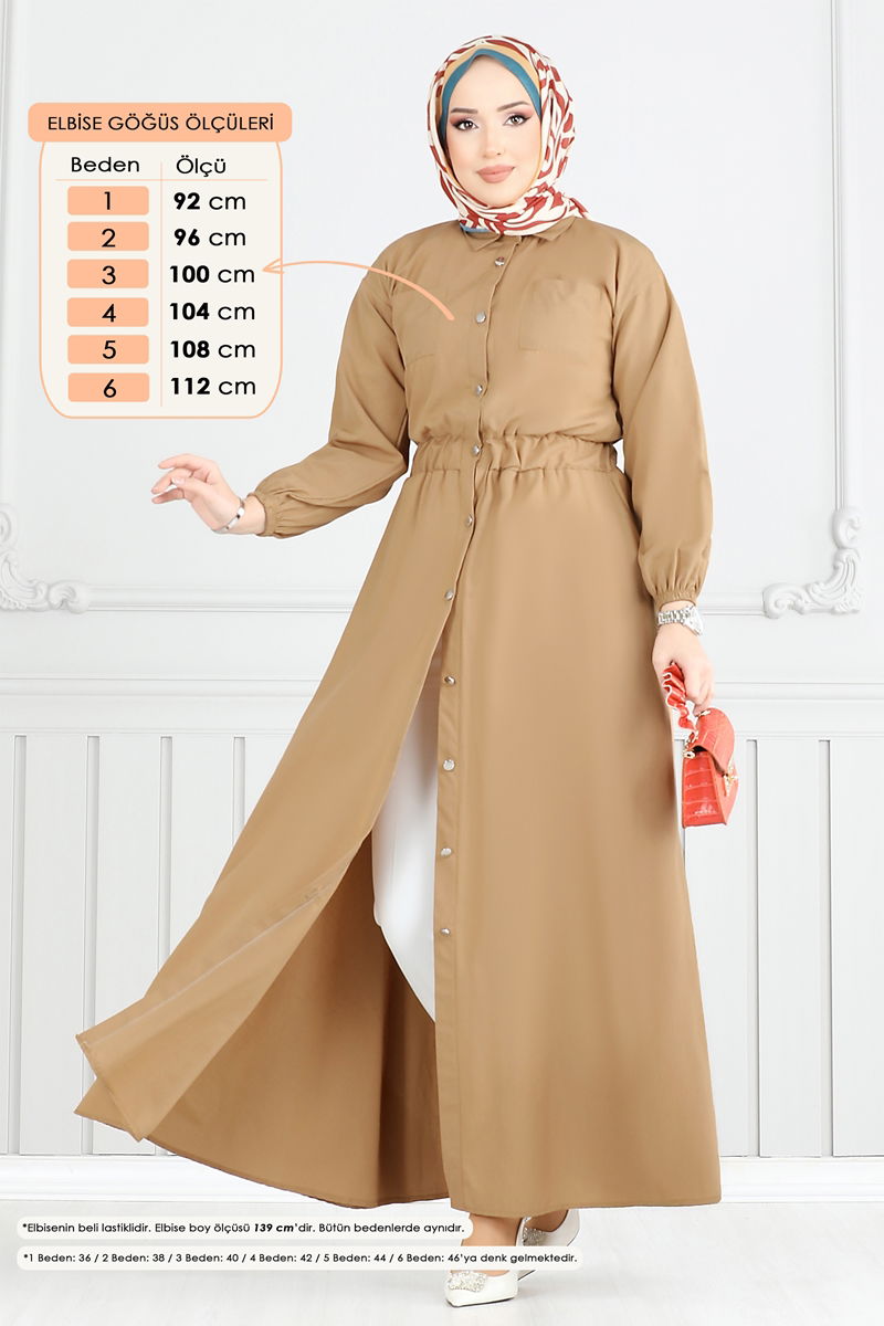 This stylish and functional Elastic Waist Dress is essential for your modest wear collection. Suitable for all seasons, it can be washed easily at 30 degrees using a gentle cycle. Made from terrycotton fabric, it offers both comfort and elegance, maintaining its shape over time. The shirt collar and front button design merge classic and contemporary styles. Its elastic waist and cuffs provide all-day comfort, while practical side pockets enhance functionality. The measurements of the model shown size 1 are: Height: 165 cm, Chest: 80 cm, Waist: 68 cm, Hips: 96 cm.
