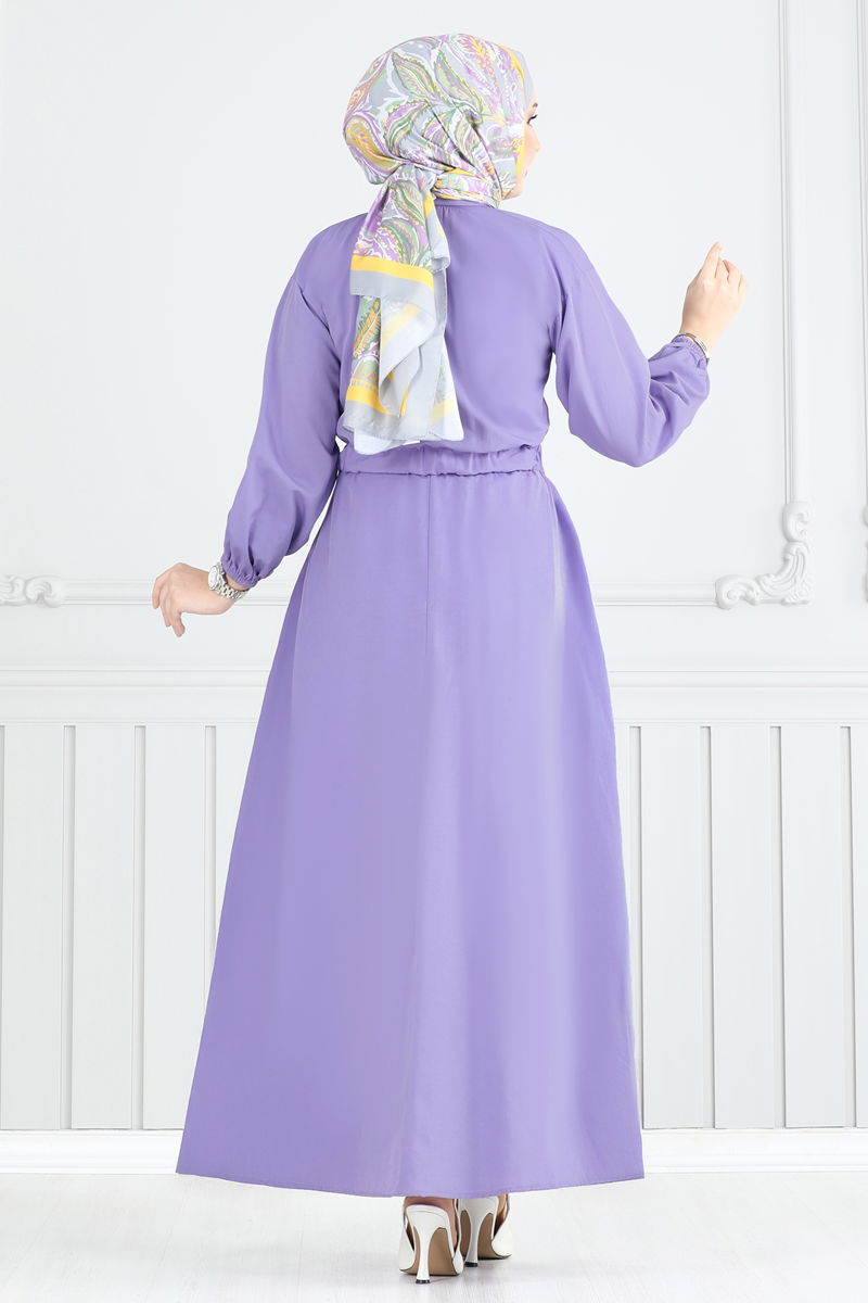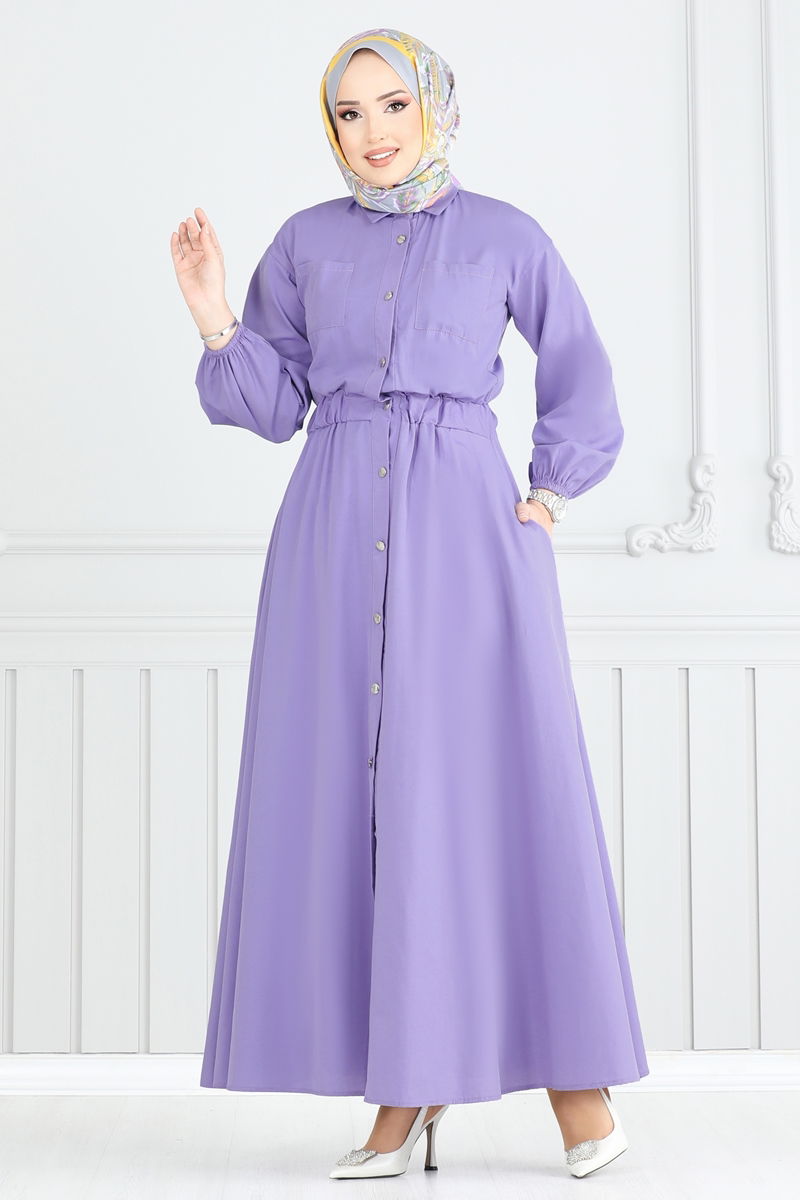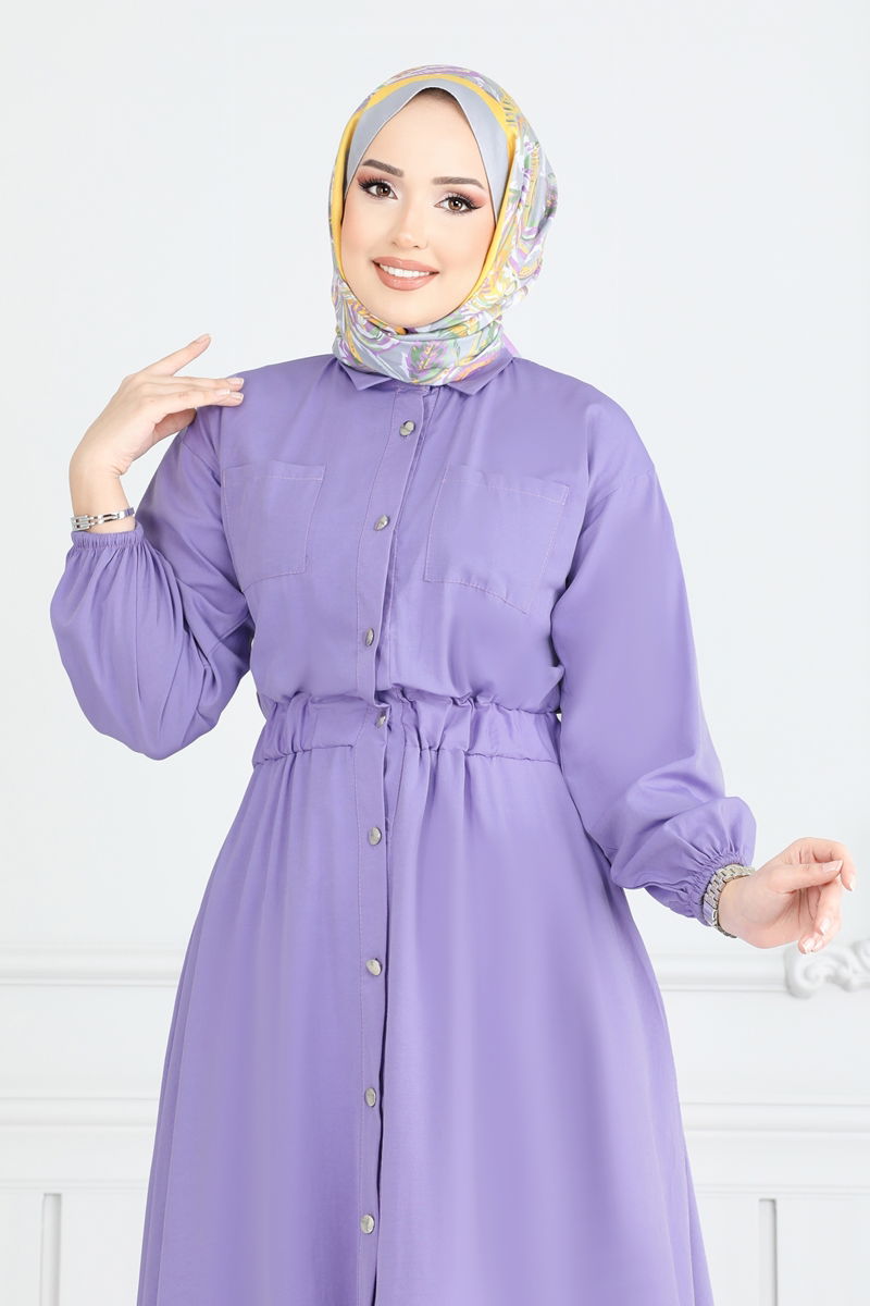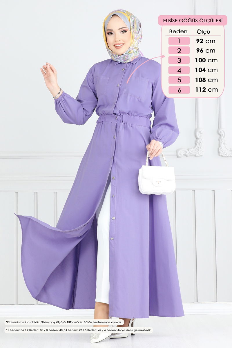 This stylish and functional Elastic Waist Dress is essential for your modest wear collection. Suitable for all seasons, it can be washed easily at 30 degrees using a gentle cycle. Made from terrycotton fabric, it offers both comfort and elegance, maintaining its shape over time. The shirt collar and front button design merge classic and contemporary styles. Its elastic waist and cuffs provide all-day comfort, while practical side pockets enhance functionality. The measurements of the model shown size 1 are: Height: 165 cm, Chest: 80 cm, Waist: 68 cm, Hips: 96 cm.