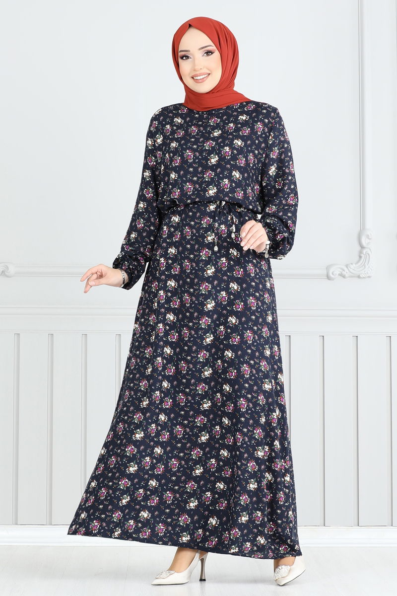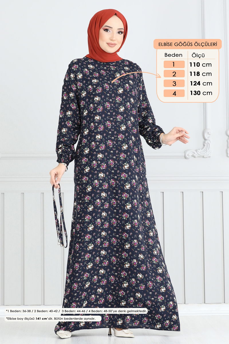 This floral-patterned modest dress catches the eye with its elegant design and can be comfortably worn in all seasons. Requiring hand wash, this special design is made of viscose fabric and offers comfortable wear. The dress, featuring a zipper at the back and elastic cuffs, has a stand-up collar. It is light and practical due to its lining-free structure. The dress also comes with a belt that matches the outfit; the belt is designed with sewn ends while the middle part is left unstitched for flexibility. The belt can be used optionally or removed. The product displayed on the model is size 1, and the model's measurements are as follows: Height: 165 cm, Chest: 80 cm, Waist: 68 cm, Hips: 96 cm, Weight: 54 kg.