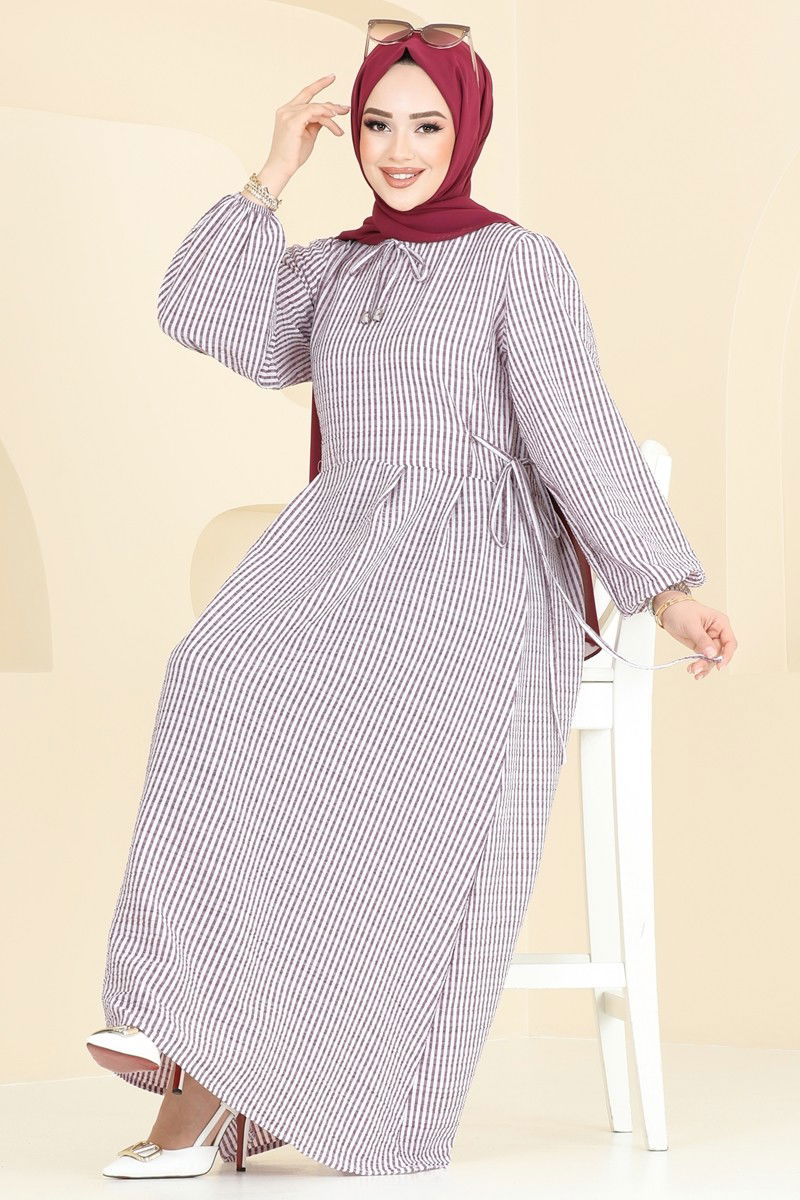The Drawstring Neck Striped Dress is a specially designed modest wear model. This dress can be comfortably worn in all seasons and can be cleaned with a gentle wash at 30 degrees Celsius. Made from crepe fabric, this chic dress features a crew neck and is without lining. Its zipper at the back makes it easy to wear and remove. The design includes drawstrings and elastic cuffs, offering a modern and comfortable wear. Measurements of the model: Height: 165 cm, Chest: 88 cm, Waist: 68 cm, Hips: 99 cm, Weight: 56 kg.