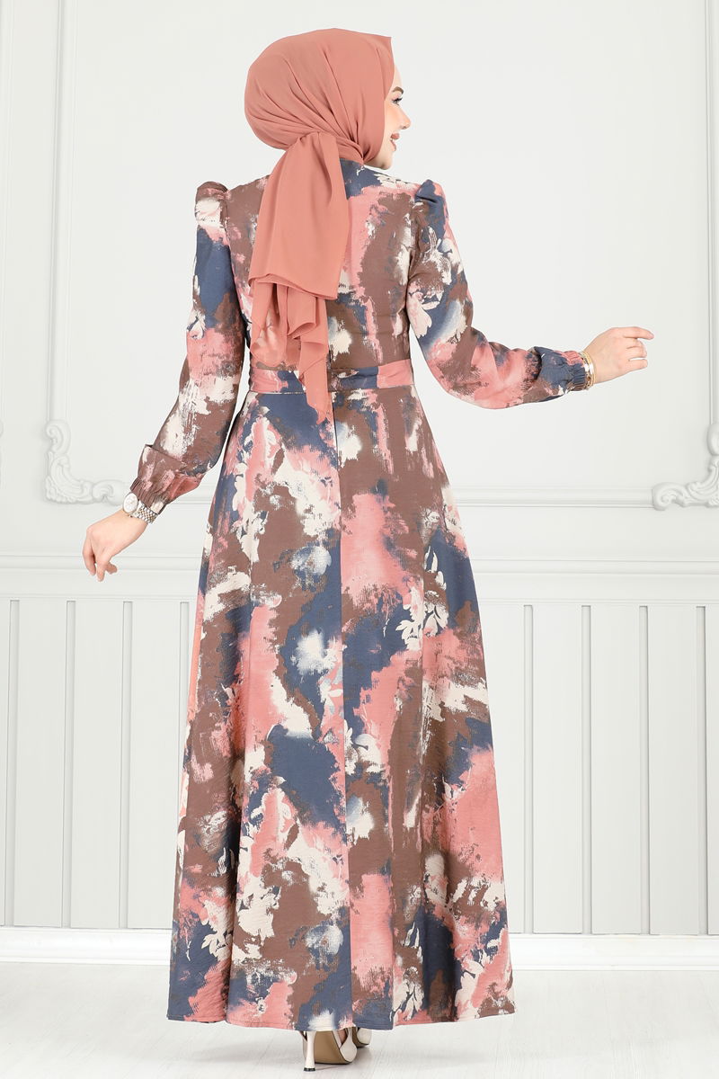 The Patterned Dress with Elastic Cuffs is a modest wear suitable for all seasons. Made from modal fabric, this dress features a crew neck and an unlined design that offers comfort. Its back zipper makes it easy to wear, while the special belt design prevents waviness and can be optionally removed. It is an ideal choice for those seeking both style and practicality. The dress can be washed gently at 30 degrees Celsius.