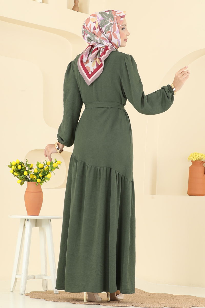 The Asymmetric Layer Detailed Aerobin Dress is an elegant choice that can be used across all seasons, designed especially for those who prefer modest clothing. Suitable for gentle wash at 30 degrees. Features a bike neck and elastic cuffs for a contemporary design. Its lining-free structure and a button accessible from the back provide comfortable wear. The belt is designed to prevent wavering; it can optionally be removed. The superior quality of Aerobin fabric offers both comfort and elegance combined.