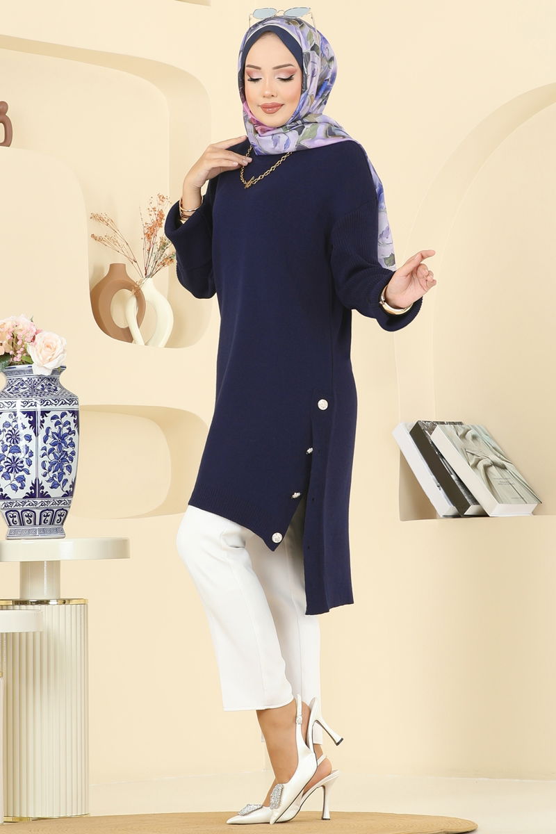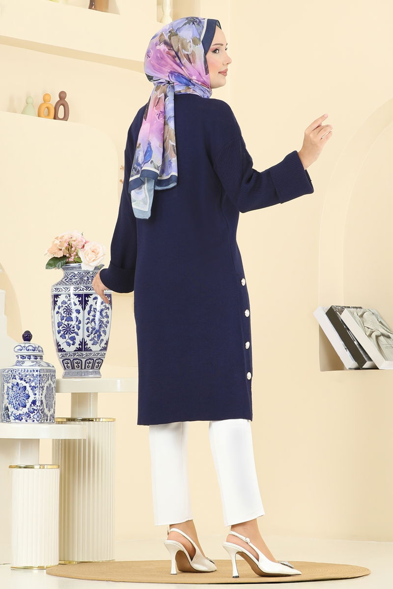 Lacivert Düğme Detaylı Yırtmaçlı Tunik
