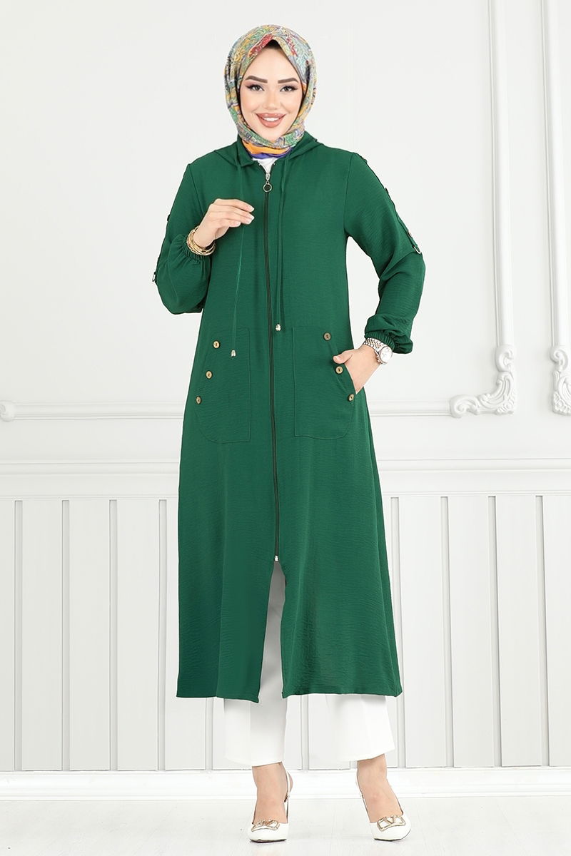 Ürün Özelliği : Yeni sezon tesettür moda ürünüdür. Yarın likralı olduğundan kullanımı son derece rahattır. Ürün Kapşonlu yakadır. Astarsızdır. Ürün Önden fermuarlıdır. Kapşon ürüne dikilidir. Düğmeler aksesuardır. Cep mevcuttur. Manşet lastiklidir. Konsept fotoğraf çekimlerinden dolayı üründe ton farklılığı olabilir.
