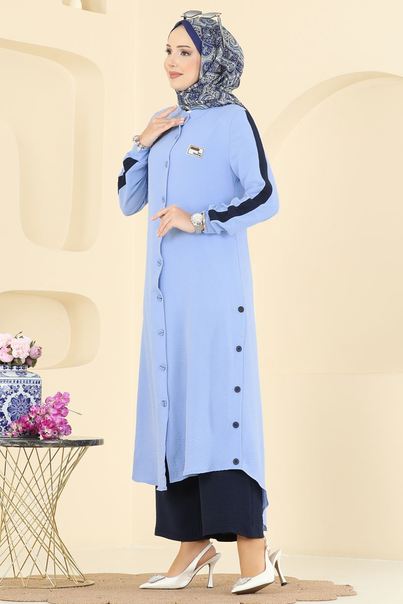 Ürün Tanımı: Yeni sezon tesettür modası üründür.Yarım Hakim yakaya sahiptir.Ön kısmı düğmeli tasarımdır.Yırtmaçlı düğmeler dekoratif amaçlıdır.Astarsızdır.Kol ağzında arma detayı mevcuttur.Pantolon beli elastiktir.Fotoğraf çekimi sebebiyle renk farklılıkları gözlenebilir.