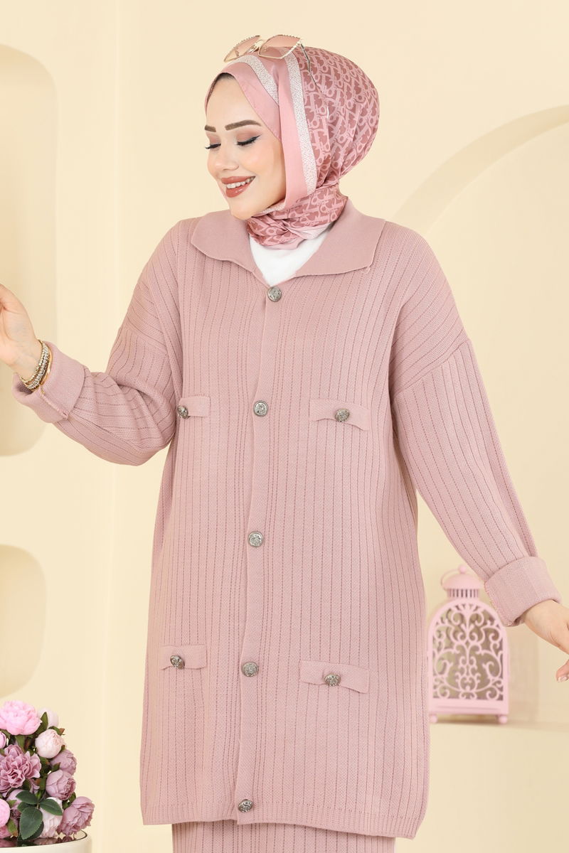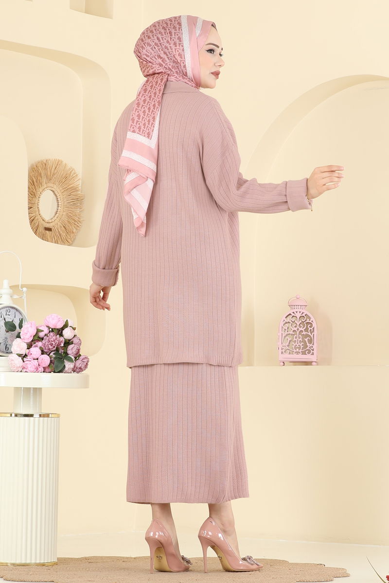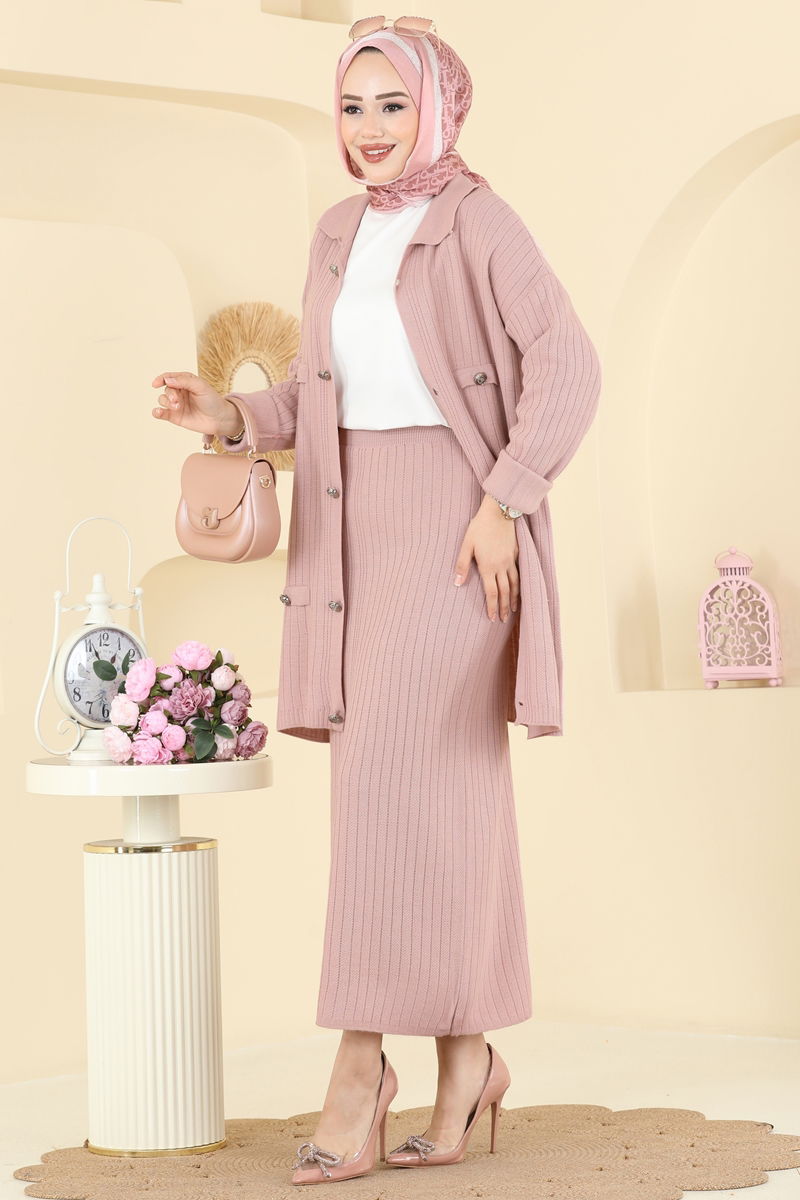 Düğme Ayrıntılı Triko Etek ve Hırka Takımı - Pudra Rengi