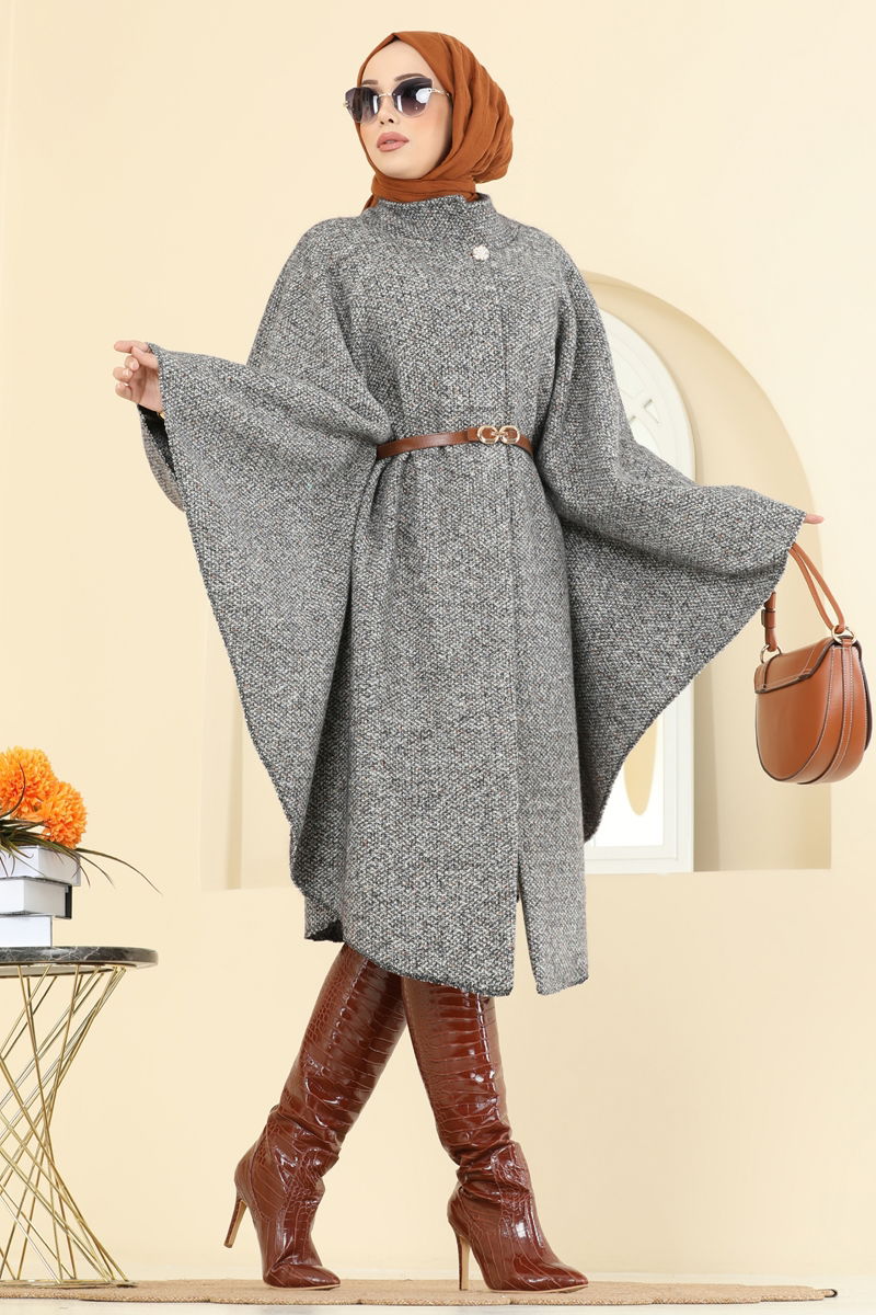 Bu zarif Antrasit Tüvit Panço, tesettüre uygun şık bir seçimdir. 30 derecede hassas yıkama imkanı sunar. Rahat kullanım için tasarlanmış hakim yaka ve astarsız yapıya sahiptir. Fonksiyonel ön düğmeler ile pratik giyim sunar. Ayarlanabilir kemer ile farklı stillere kolayca uyum sağlar, gerekirse çıkartılabilir. Soğuk kış günlerinde şıklık ve sıcaklık sunan ideal bir üründür.PANÇO BEDEN ÖLÇÜLERİ (CM)Beden Göğüs Boy Standart 160 104 Ağırlık(Kg):1.05 -