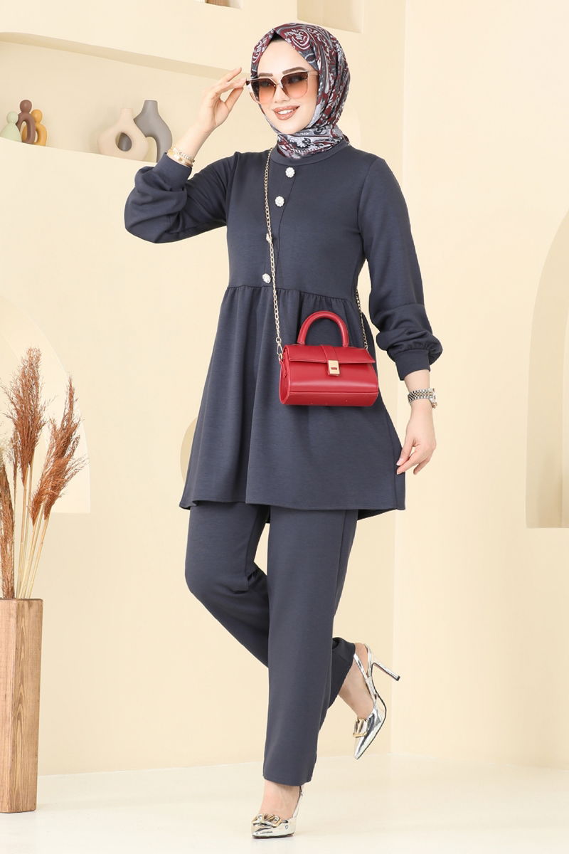 Antrasit Modal Takım - Düğme ve Taş Detaylı