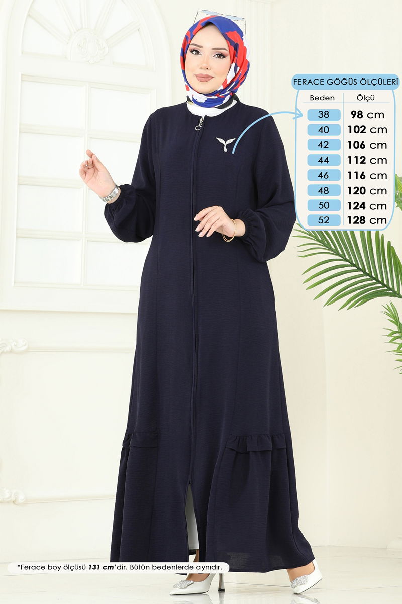 Zarif ve rahat tasarımıyla Etek Fırfırlı Aerobin Ferace, tesettür giyimde estetik ve konforu birleştiriyor. Dört mevsim boyunca rahatlıkla giyilebilen bu ferace, 30 derecede hassas yıkama imkanıyla öne çıkıyor. Hafif ve hava alabilen Aerobin kumaşı ile günlük kullanımda mükemmel konfor sunar. Bisiklet yaka ve astarsız tasarımıyla modern bir duruş sergilerken, ön tarafındaki fermuar detayı pratik bir kullanım sunar. Lastikli manşetleri ise estetik bir dokunuş ekler.FERACE BEDEN ÖLÇÜLERİ (CM)Beden Göğüs Boy 38 98 131 40 102 131 42 106 131 44 112 131 46 116 131 48 120 131 50 124 131 52 128 131 Ağırlık(Kg):0.44 -