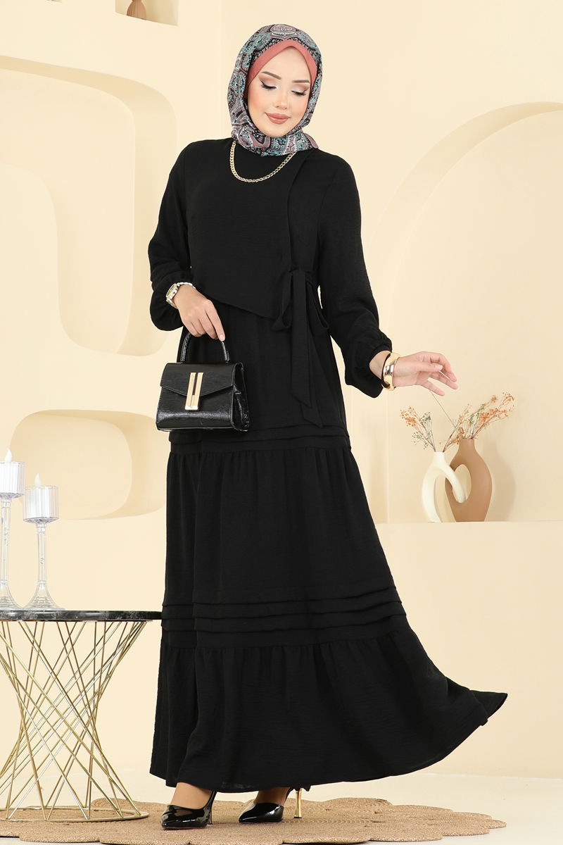 Zarif kat kat etekli bu siyah elbise, aerobin kumaşın hafif ve nefes alabilen özellikleri sayesinde tüm mevsimlerde ideal bir konfor sunar. Tesettür giyim için uygun olan bu elbise, modern bisiklet yaka ve esnek manşet detaylarıyla şık bir görünüş kazandırır. Astarı olmayışıyla hafif ve rahat bir kullanım sağlar ve 30 derecede hassas yıkama ile temizlenmesi önerilir. Sırt kısmındaki düğme ile kolayca giyilip çıkartılabilir.