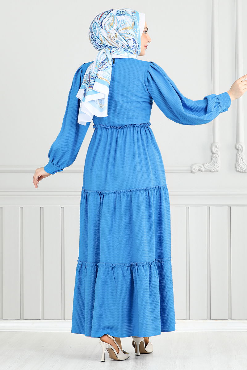 Eteği Katlı Gofre Elbise 3033TBO1101-M Mavi