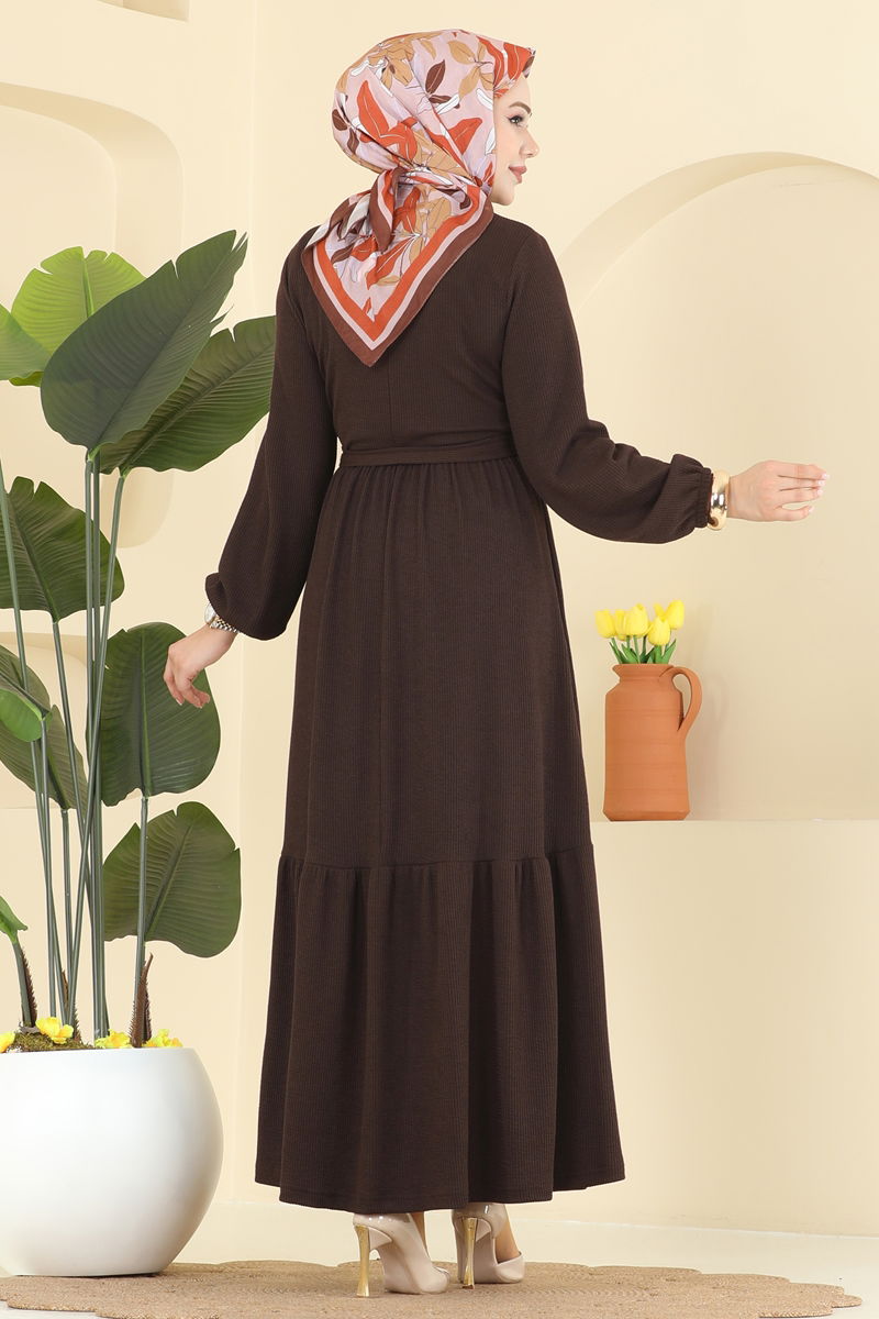Eteği Katlı Kuşaklı Elbise 4120PM271-MS Kahve