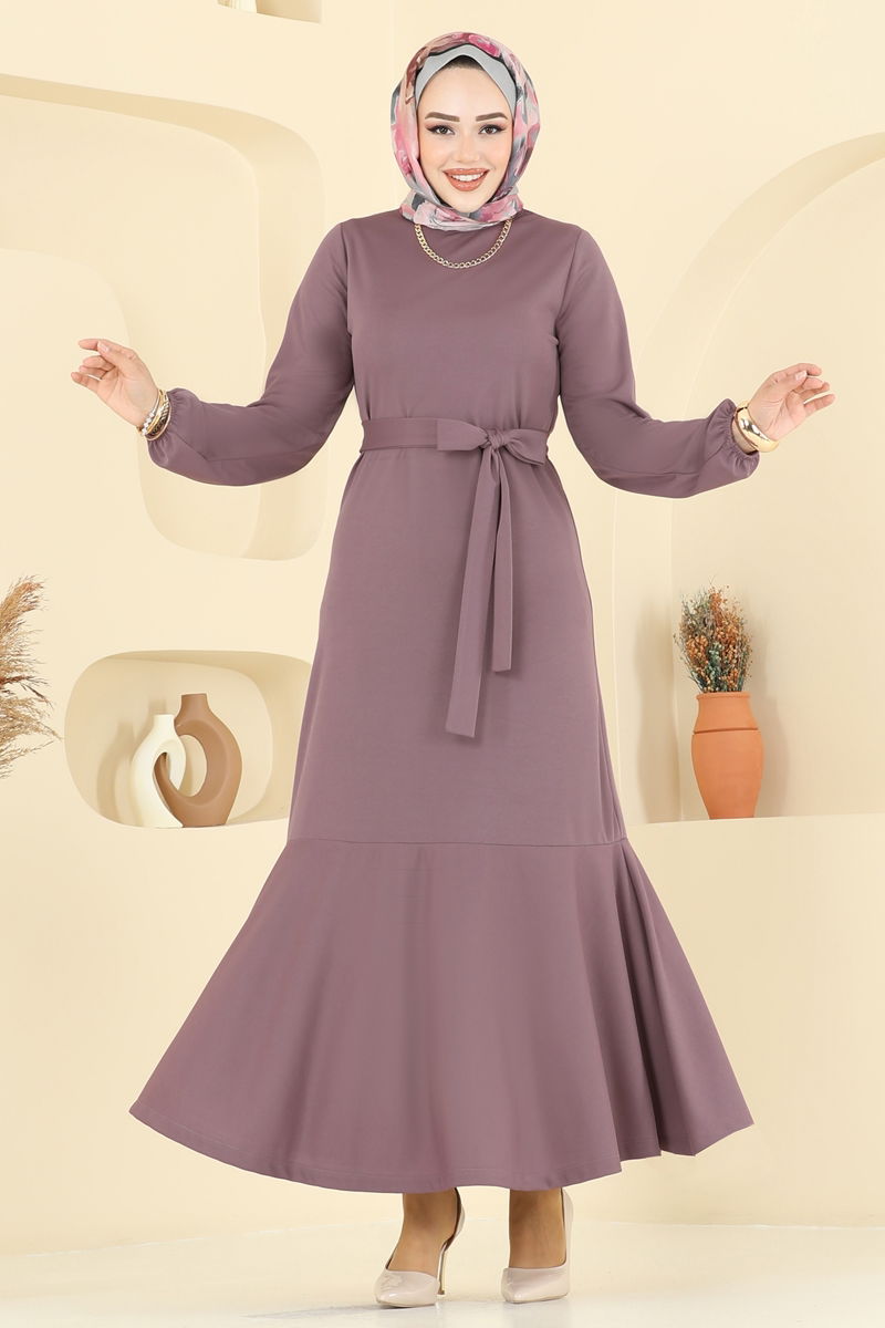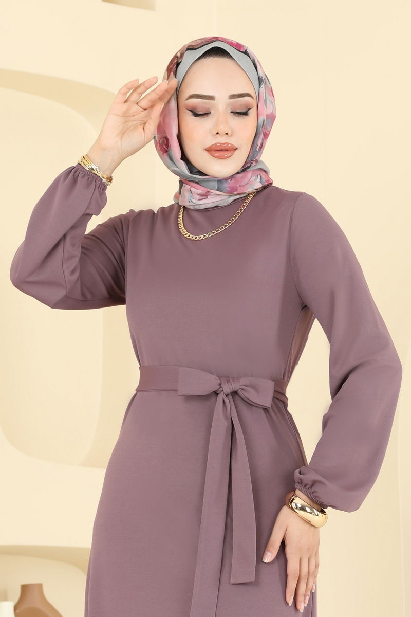 Koyu gül kurusu renkli, eteği katlı Mira elbise, dört mevsim giyilebilen şık bir tesettür tasarımıdır. 30 derecede hassas yıkama önerilen bu elbise, hafif Mira kumaşından yapılmıştır. Bisiklet yaka ve astarsız tasarımı ile konforlu bir kullanım sunar. Üründe bulunan özel tasarımlı kemer, iki ucu sabit ve ortası serbest bırakılmıştır, isteğe bağlı çıkarılabilir. Şık tasarımıyla dikkat çeker ve her ortamda beğeni toplar.