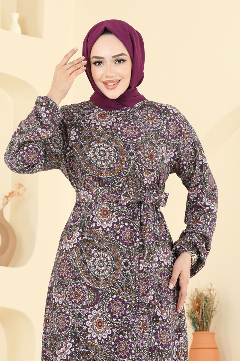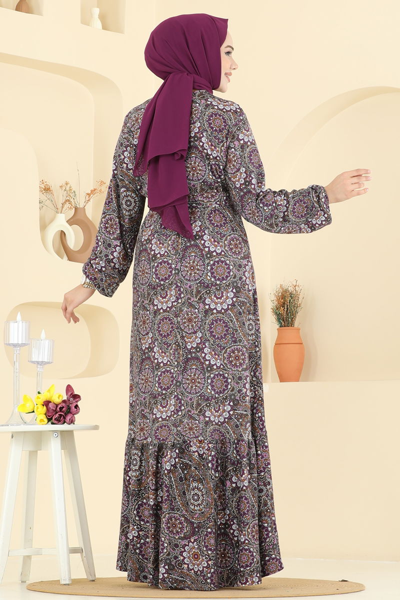 Etnik Desen Tesettür Elbise 4128PM271-MS Desen 1 Mürdüm