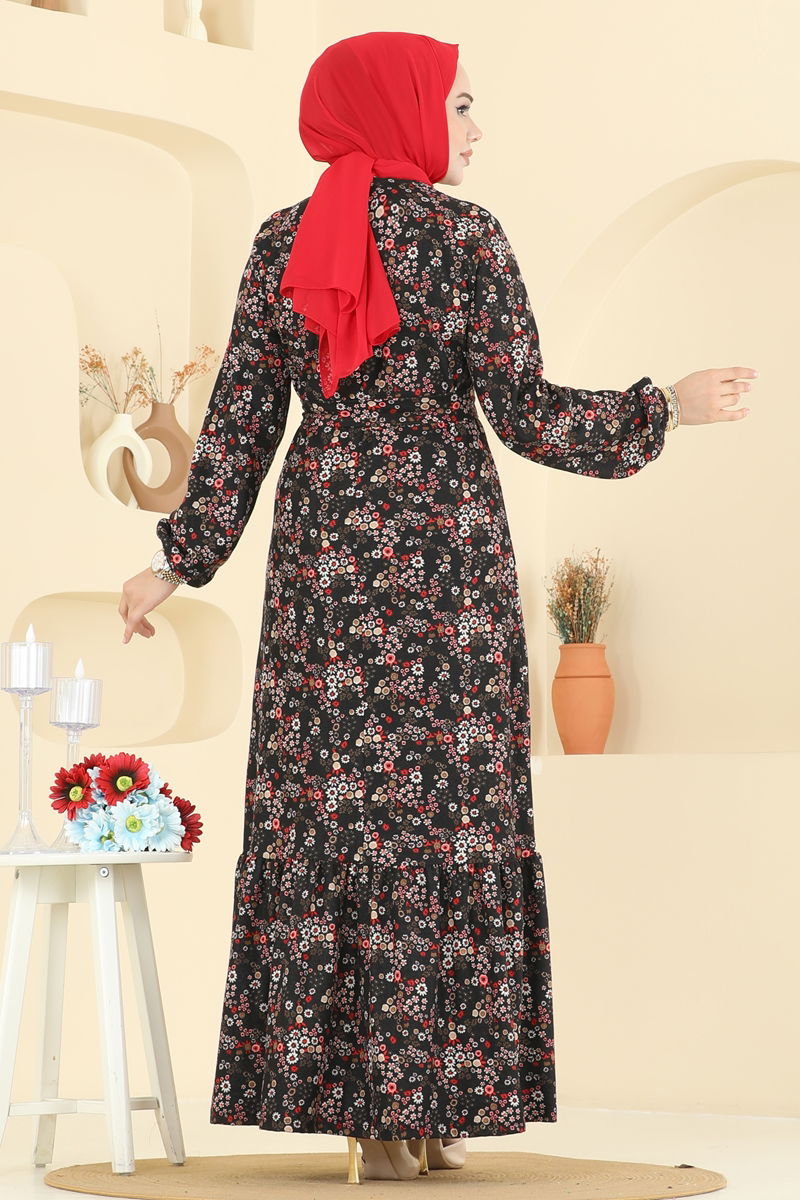 Etnik Desen Tesettür Elbise 4128PM271-MS Desen 2 Siyah